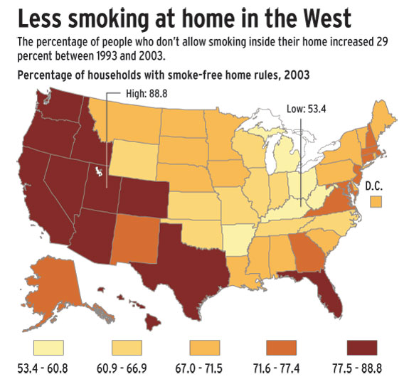 Utah led the nation, with people in nearly nine out of 10 homes saying smoking was never allowed. The state’s large population of Mormons, who eschew tobacco, probably contributed to that statistic, the agency said.