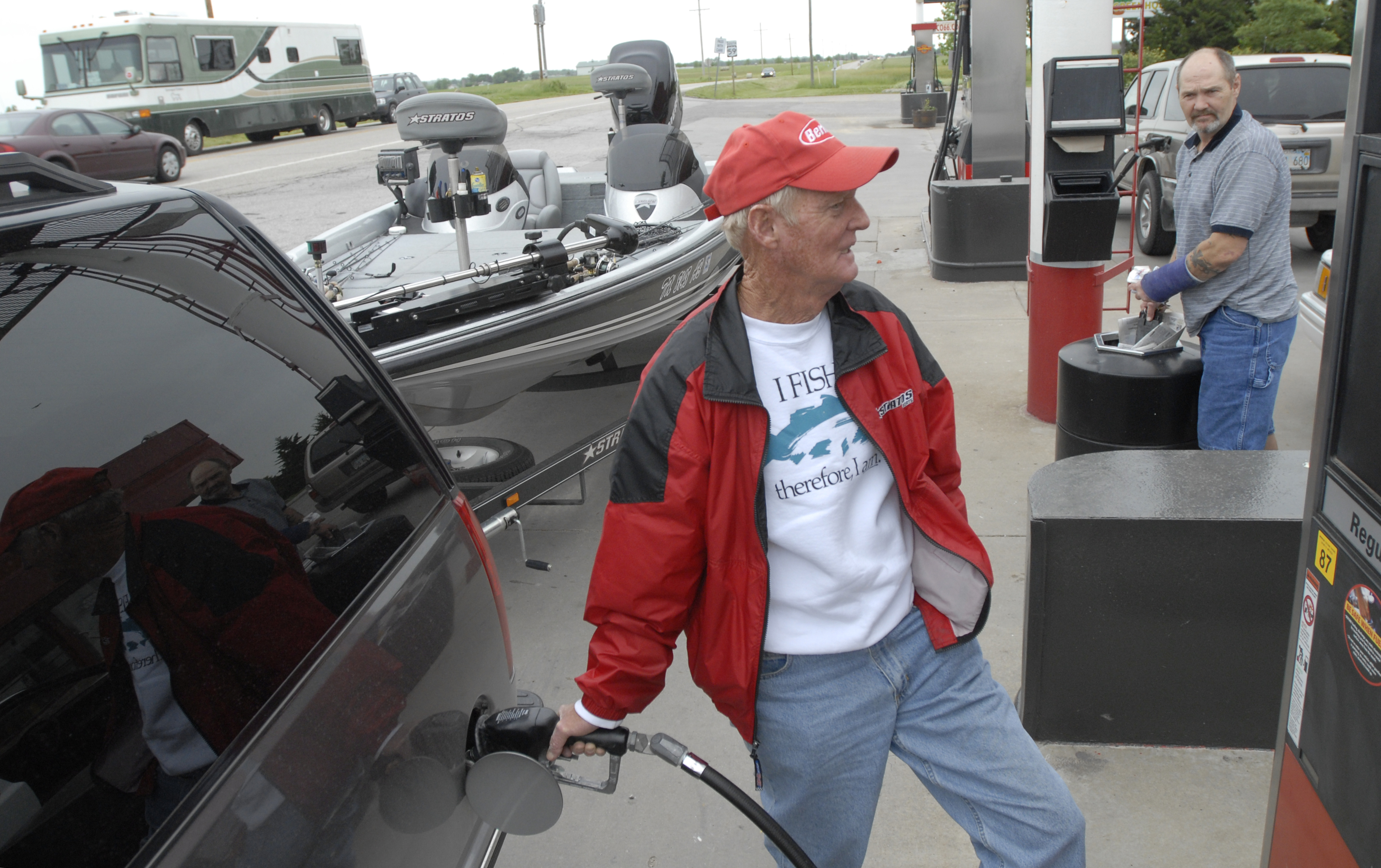Bob Bryan, of Dallas, center, gasses up his vehicle with his boat in tow. Bryan was headed to Lawrence to visit friends and to fish at Perry Lake during Memorial Day weekend. It