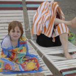 Bekah Keys, 6, left, takes a break to warm up while her mother, Lisa Keys, left, takes shelter under a towel during a light rain at Lawrence Outdoor Aquatic Center, 727 Ky. The pool opened Saturday and will remain open from 1 p.m. until 8:45 p.m. seven days a week for the rest of the season. Starting Tuesday, morning lap swimming will be available from 10 a.m. to 12:45 p.m. Monday through Friday through Aug. 24.