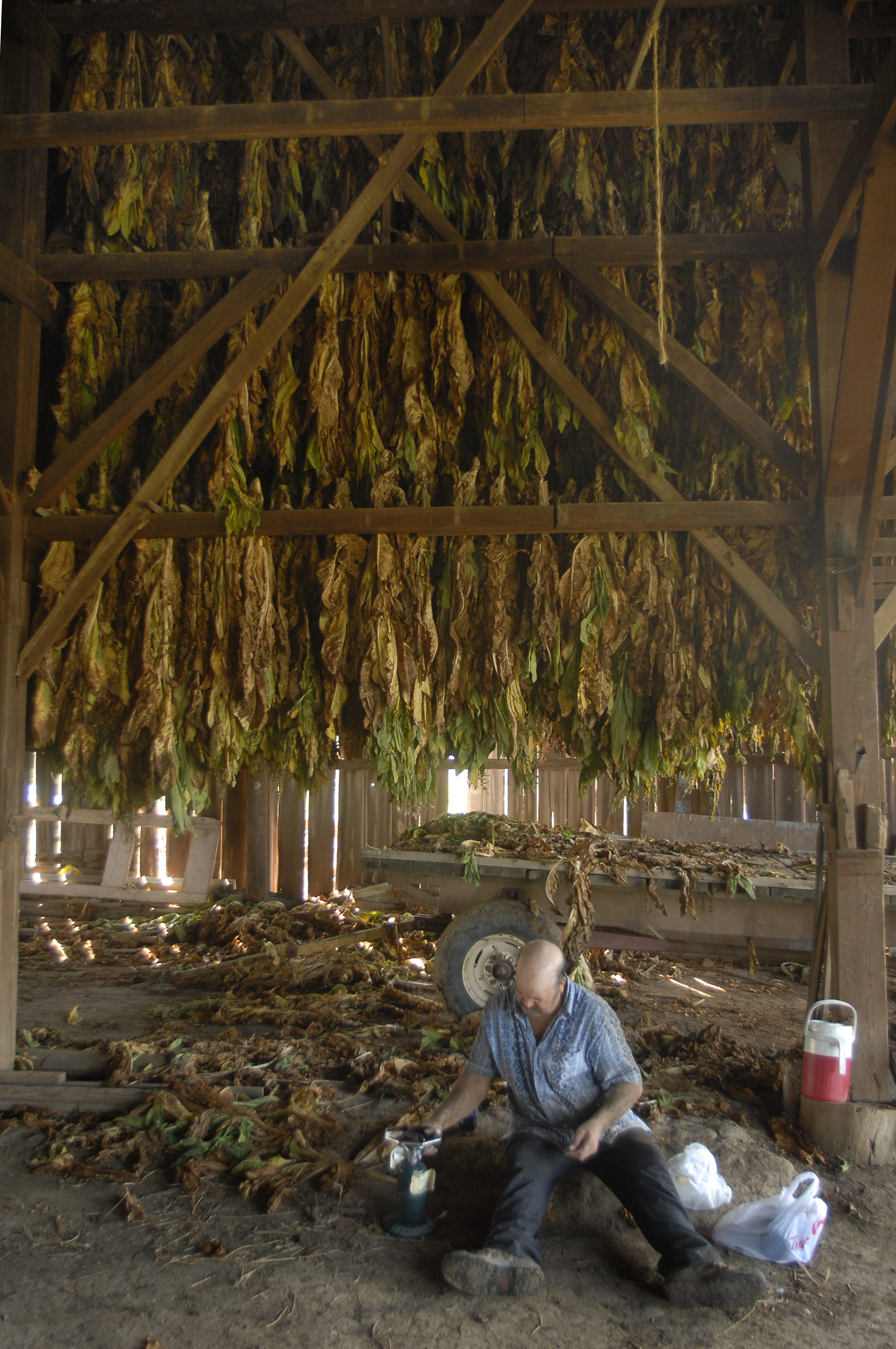 Armando Aguirre sits down to enjoy some lunch in the drying barn among leaves harvested that morning. Growing tobacco is labor-intensive work, requiring about 200 hours per acre from start to finish.