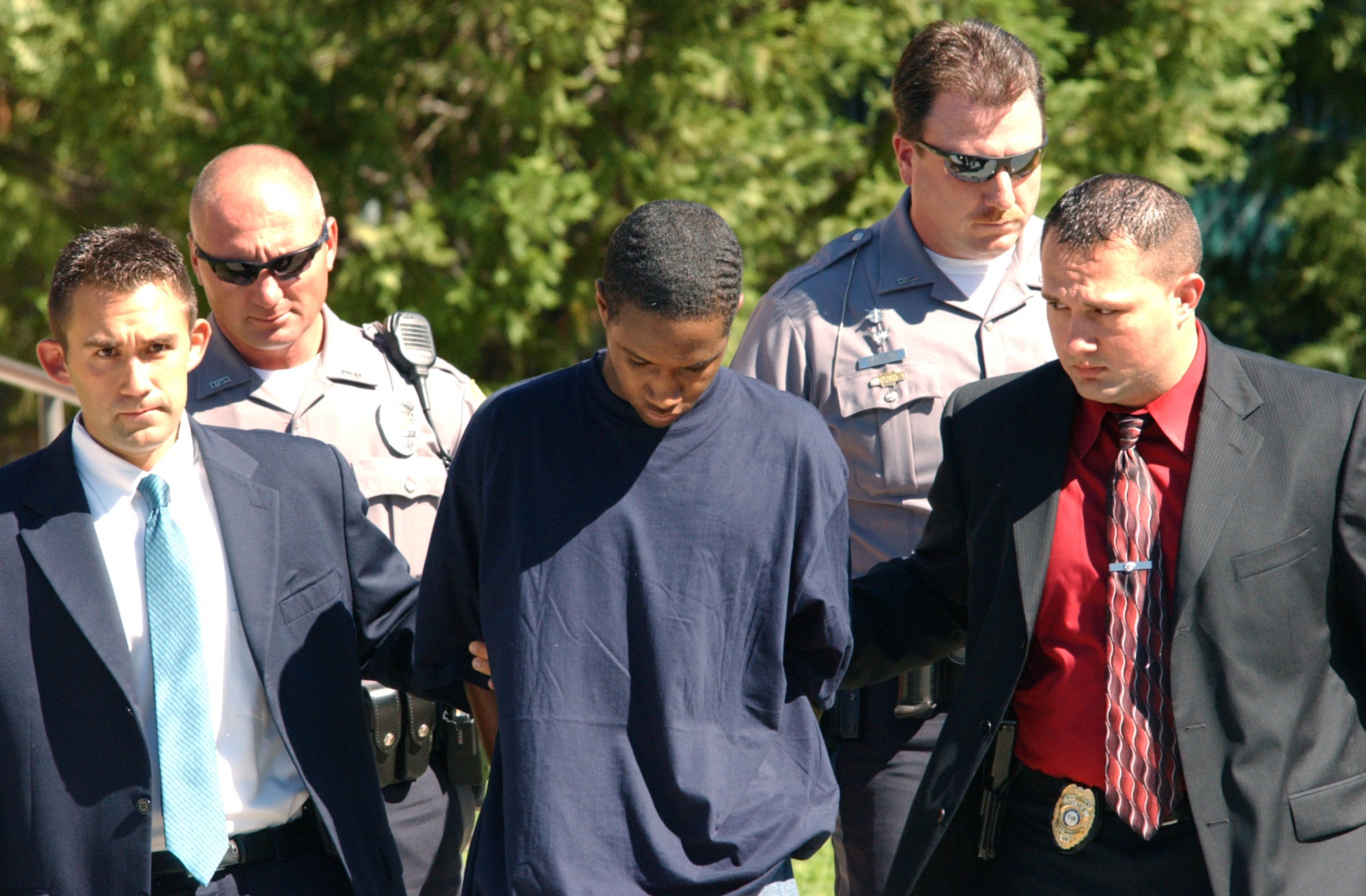 Loyer Braden, center, a suspect in Friday's shooting of two Delaware State University students, is escorted from Dover police station to court in Dover, Del., on Monday. Braden, of East Orange, N.J., was charged with attempted murder, assault and reckless endangerment, as well as a gun charge, according to court documents.
