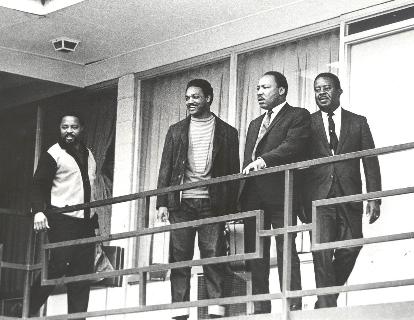 Martin Luther King Jr. and aides, from left, Hosea Williams, Jesse Jackson Jr. and Ralph Abernathy return to the Lorraine Motel in Memphis, Tenn., in this April 3, 1968, file photo. King was shot and killed on the balcony the next day.