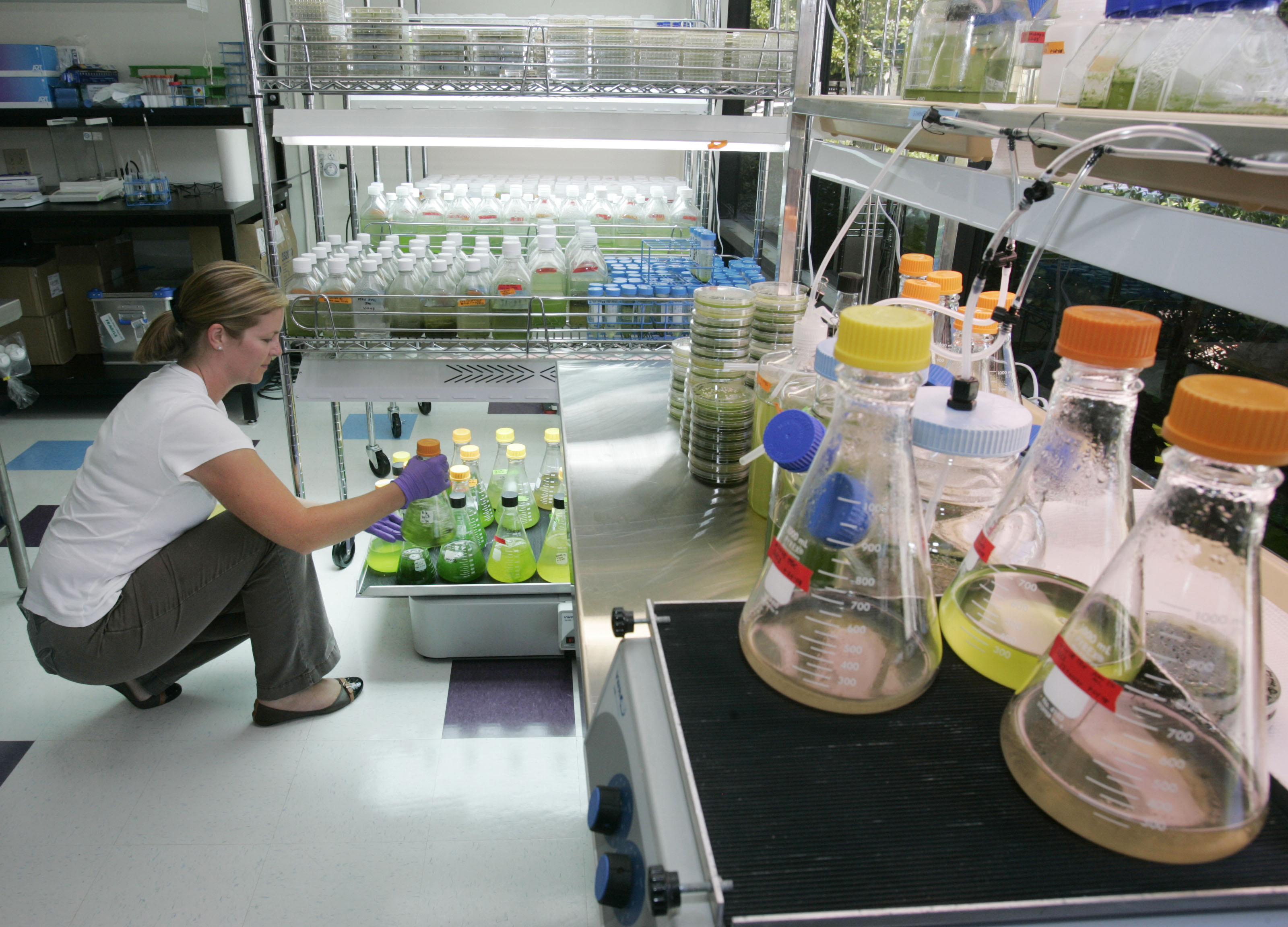 Charity DeLuca, Vice president of Research Relations at LiveFuels in San Carlos, Calif., works with different algae samples in July. Behind the scenes, the airline industry is aggressively pushing for homegrown alternatives to petroleum-based jet fuel. A coalition that includes the Federal Aviation Administration and airline, manufacturing and airport associations wants standards for a 50 percent synthetic jet fuel approved by the end of this year..