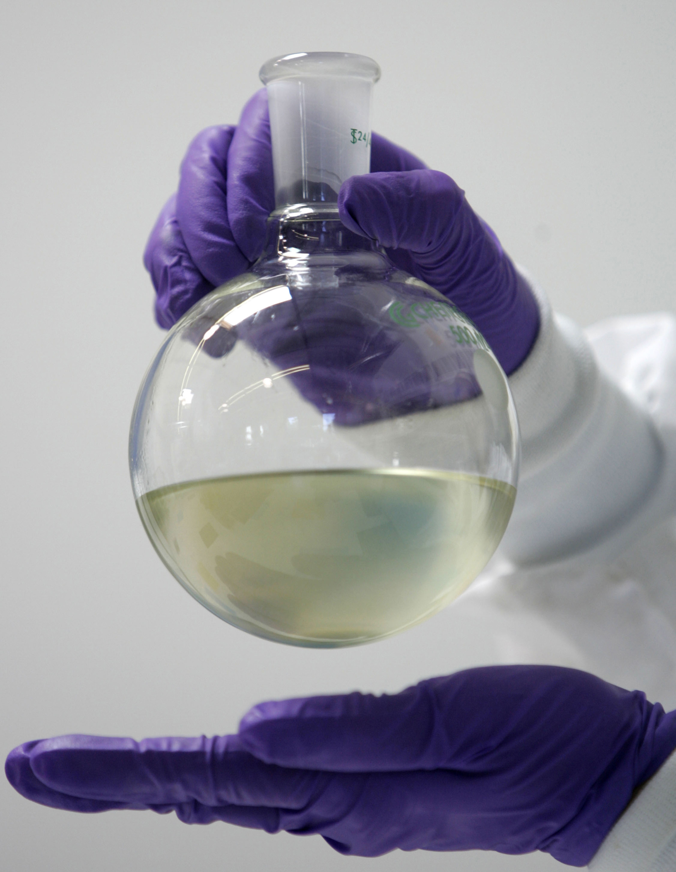 Chemist Emma Kate Payne displays a fuel sample created from algae at LiveFuels.