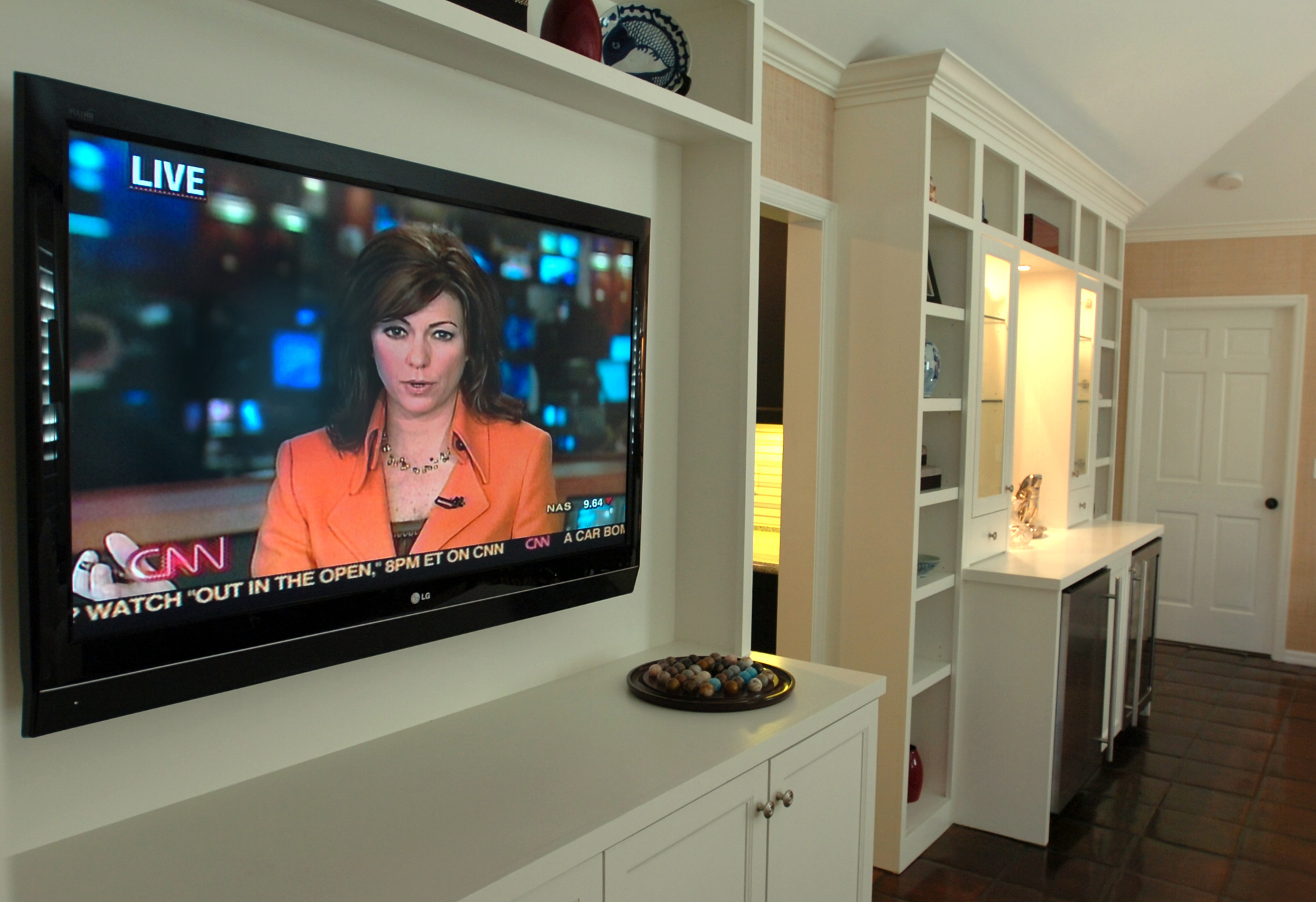 Ott has placed televisions in credenzas and bookcases for clients. He recently tucked one into a secretary desk behind fabric-lined, glass windows.
