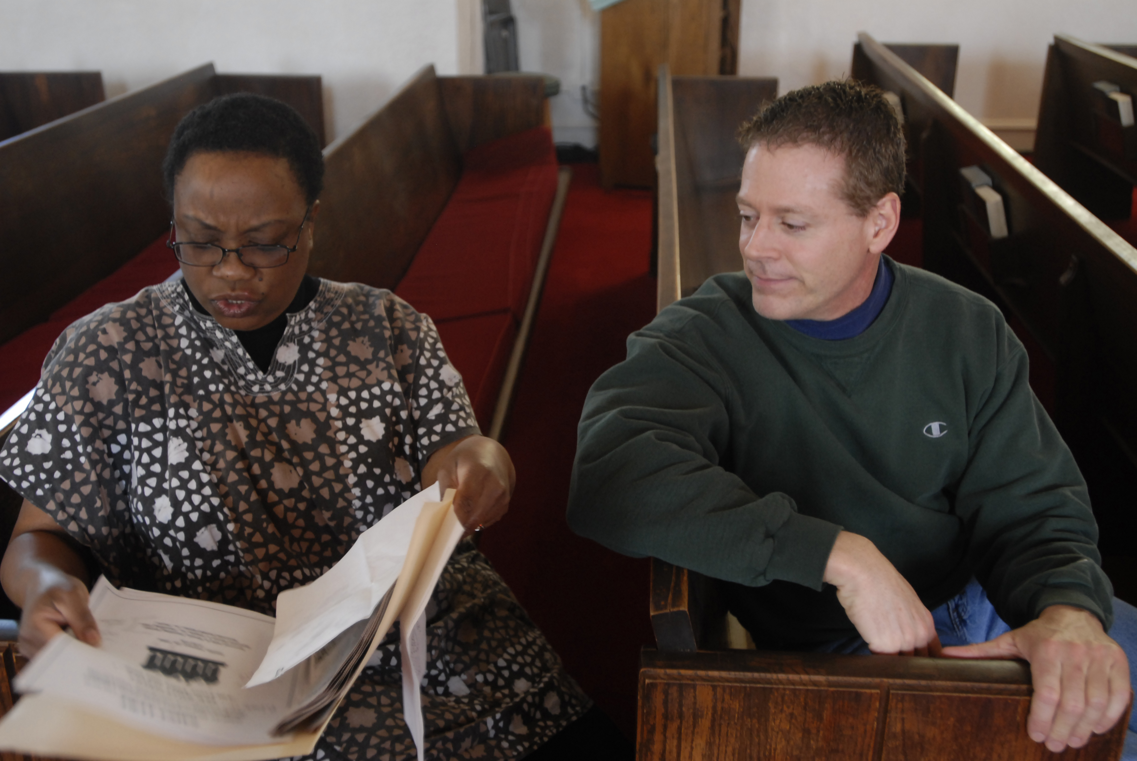 Joyce Pearson, left, and Kim Manz, of Plymouth Congregational Church, talk about the upcoming musical during Bible study and choir practice at the St. Luke African Methodist Episcopal Church, 900 N.Y. Plymouth Congregational is one of several groups participating in Sunday's celebration.