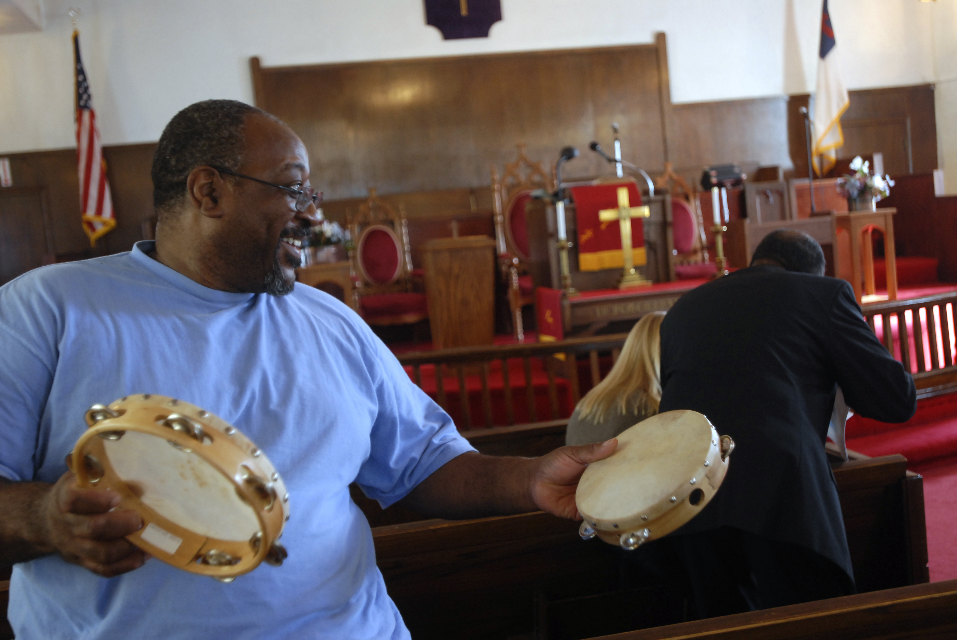 Theodore McVay, president of the St. Luke AME choir, tests out tambourines before a quick choir practice Wednesday for Sunday's Black History Month Musical.