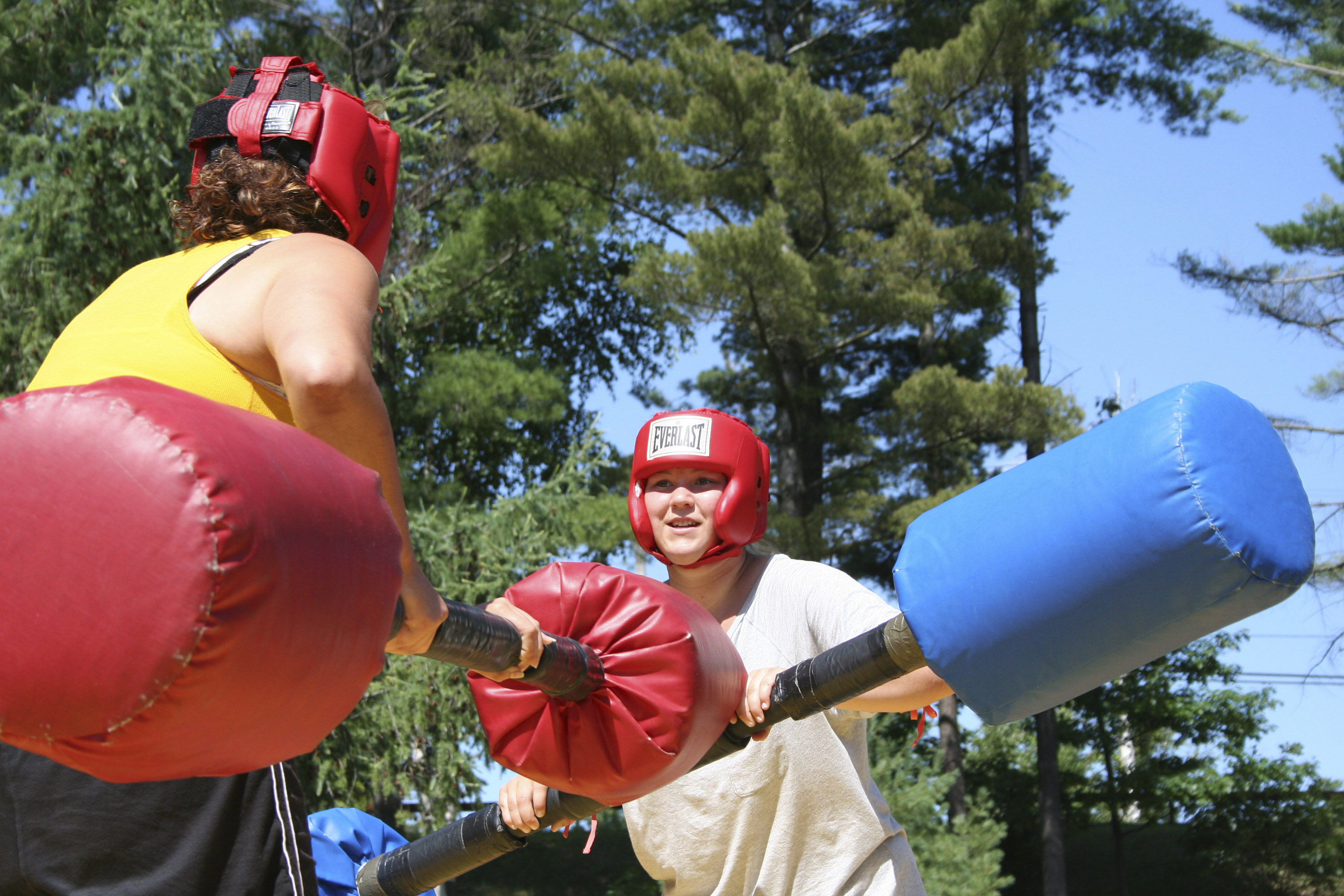Alexandra Hagemann, 19, right, jousts with an unidentified participant on an inflatable jousting arena last August at the alumni field at a Wellspring New York camp at Paul Smiths College, Paul Smiths, N.Y.