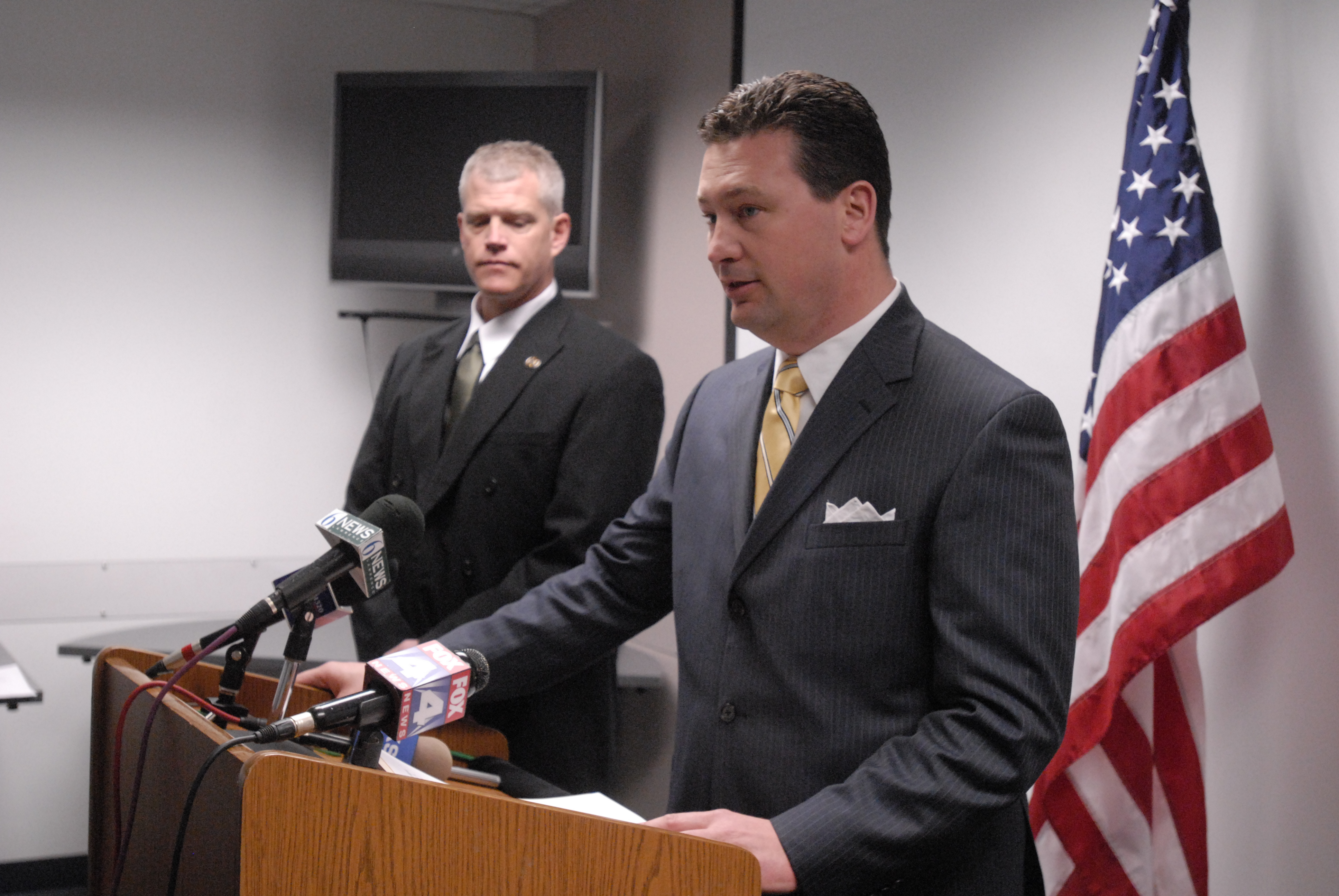 Douglas County Sheriff Ken McGovern, left, and Douglas County District Attorney Charles Branson announce first-degree murder charges Tuesday against Major C. Edwards and Durell A. Jones in the shooting death of Anthony Clacc Vital.