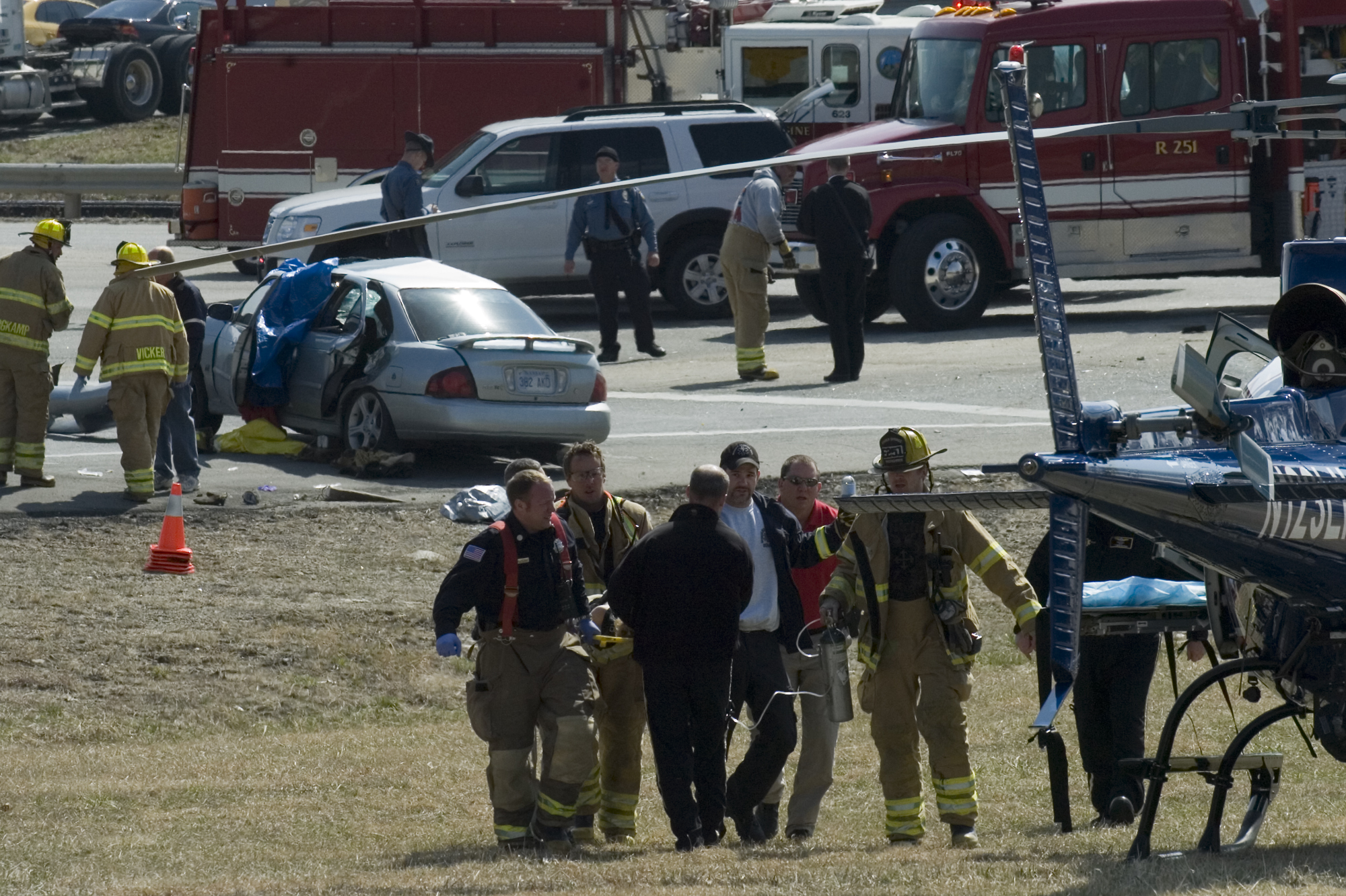 Emergency crews carry an injured passenger to be air lifted to KU Medical Center late Friday morning. An accident involving a 2002 Nissan and a pickup truck at the intersection of Kansas Highway 32 and the entrance to northbound K-7.