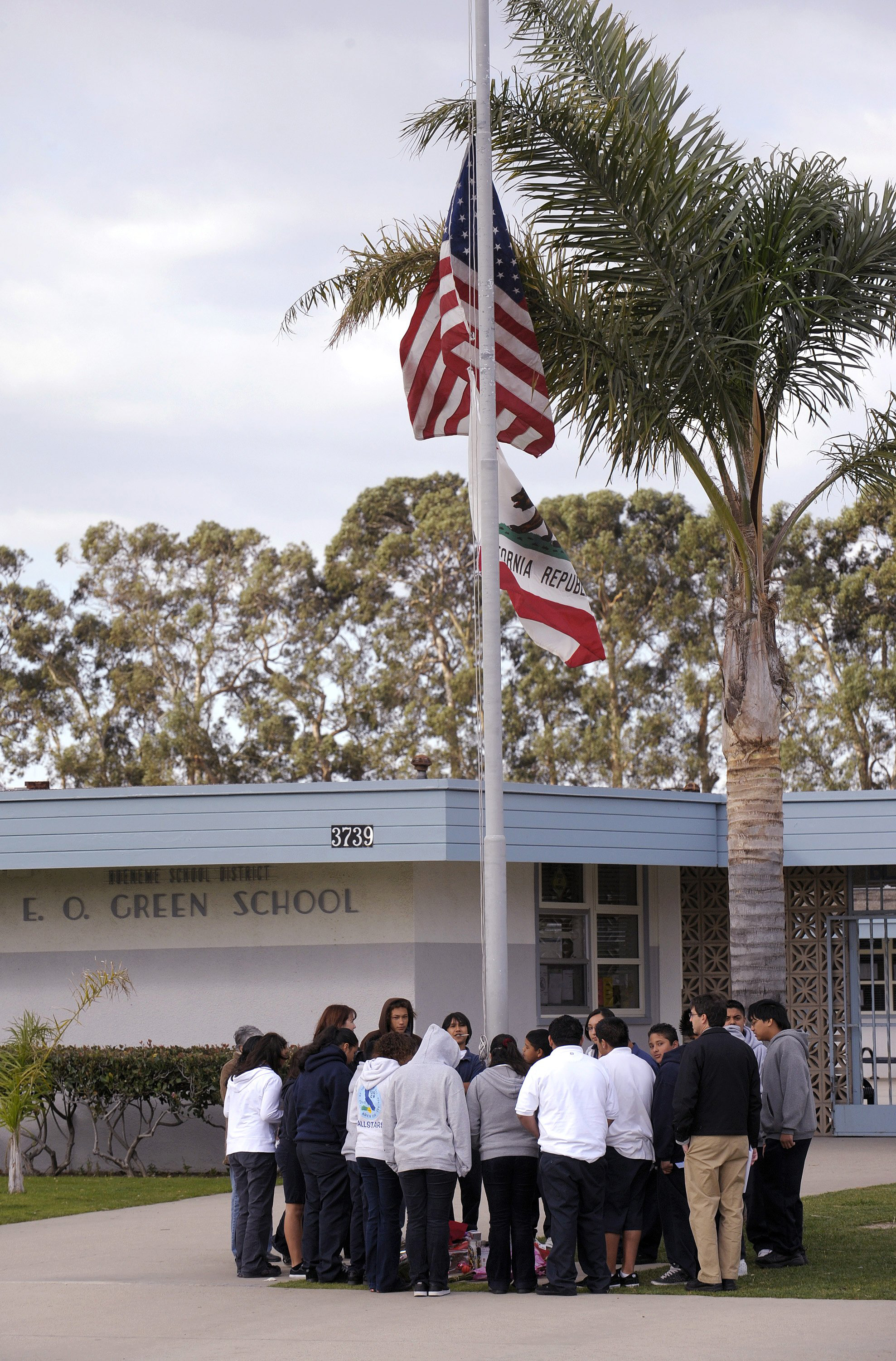 Students gather around a makeshift memorial Feb. 14 at E.O. Green Middle School, honoring slain student Lawrence King, 15, who was killed by a classmate in Oxnard, Calif., allegedly because he was gay. The slaying of King has alarmed gay rights activists and led to demands that middle schools do more to educate youngsters about discrimination on the basis of sexual orientation.