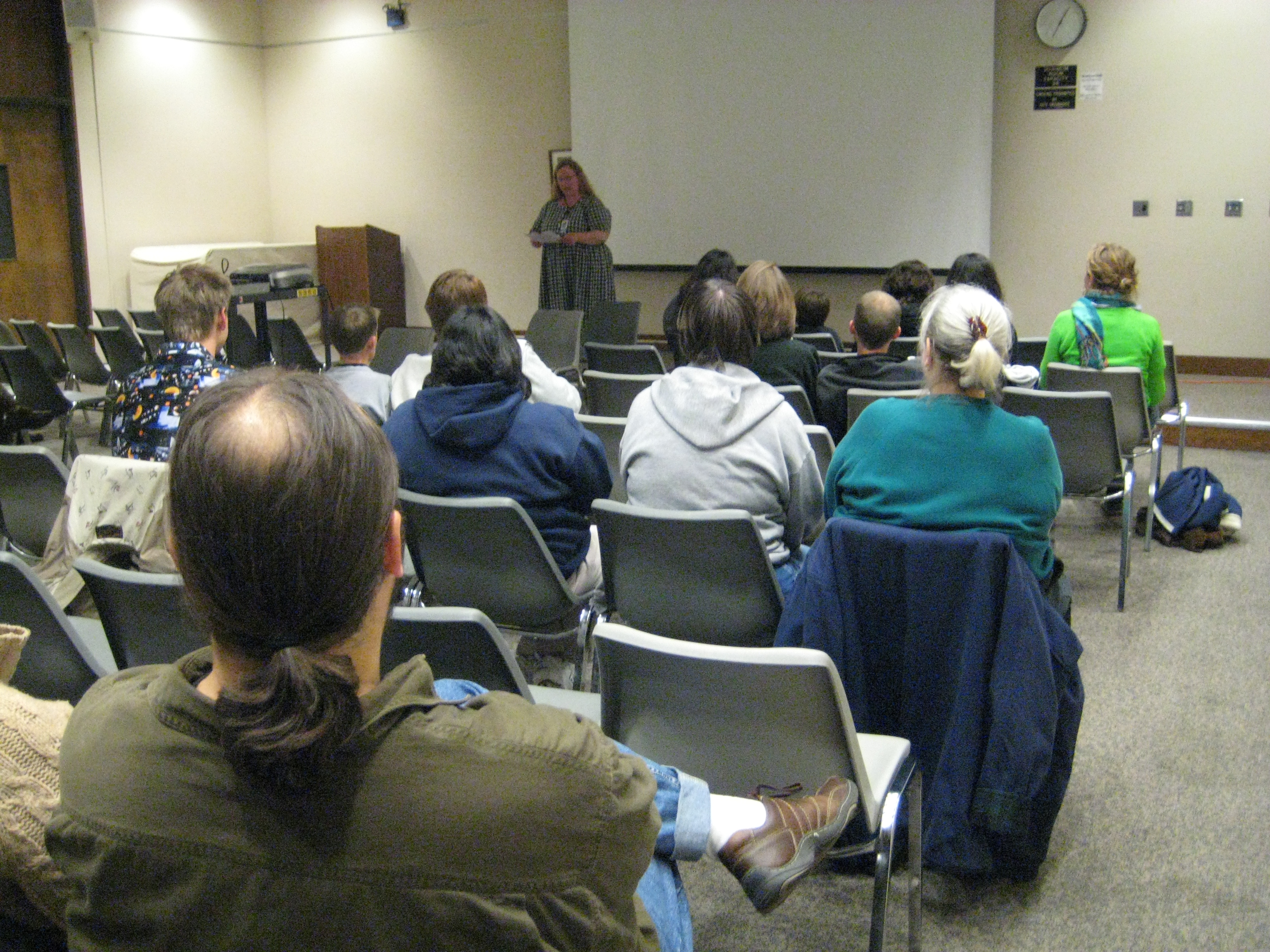 Maria Butler, community relations coordinator at the Lawrence Public Library, speaks to the group of attendants at the library's showing of Psycho.