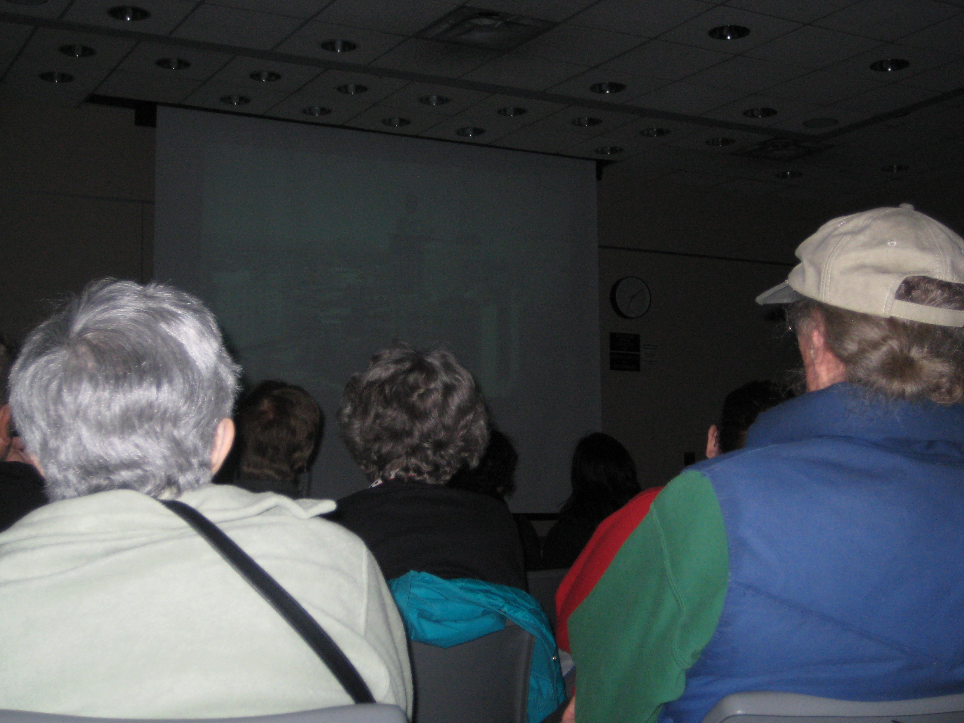 Visitors at the Lawrence Public Library watch Alfred Hitchcock's Psycho on Friday night.