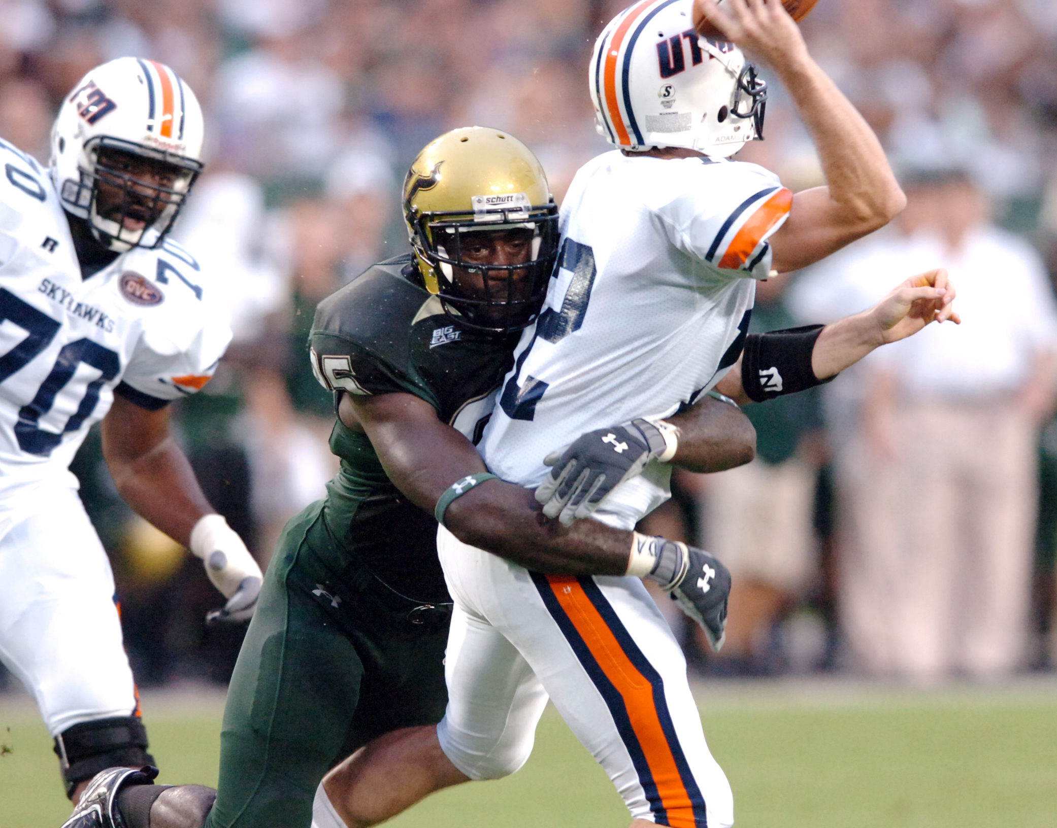 USF defensive end George Selvie hits UT Martin quarterback Cade Thompson in this Aug. 30 file photo in Tampa, Fla. Selvie, who led the country in tackles for loss last year, will look to give KU fits on Friday.