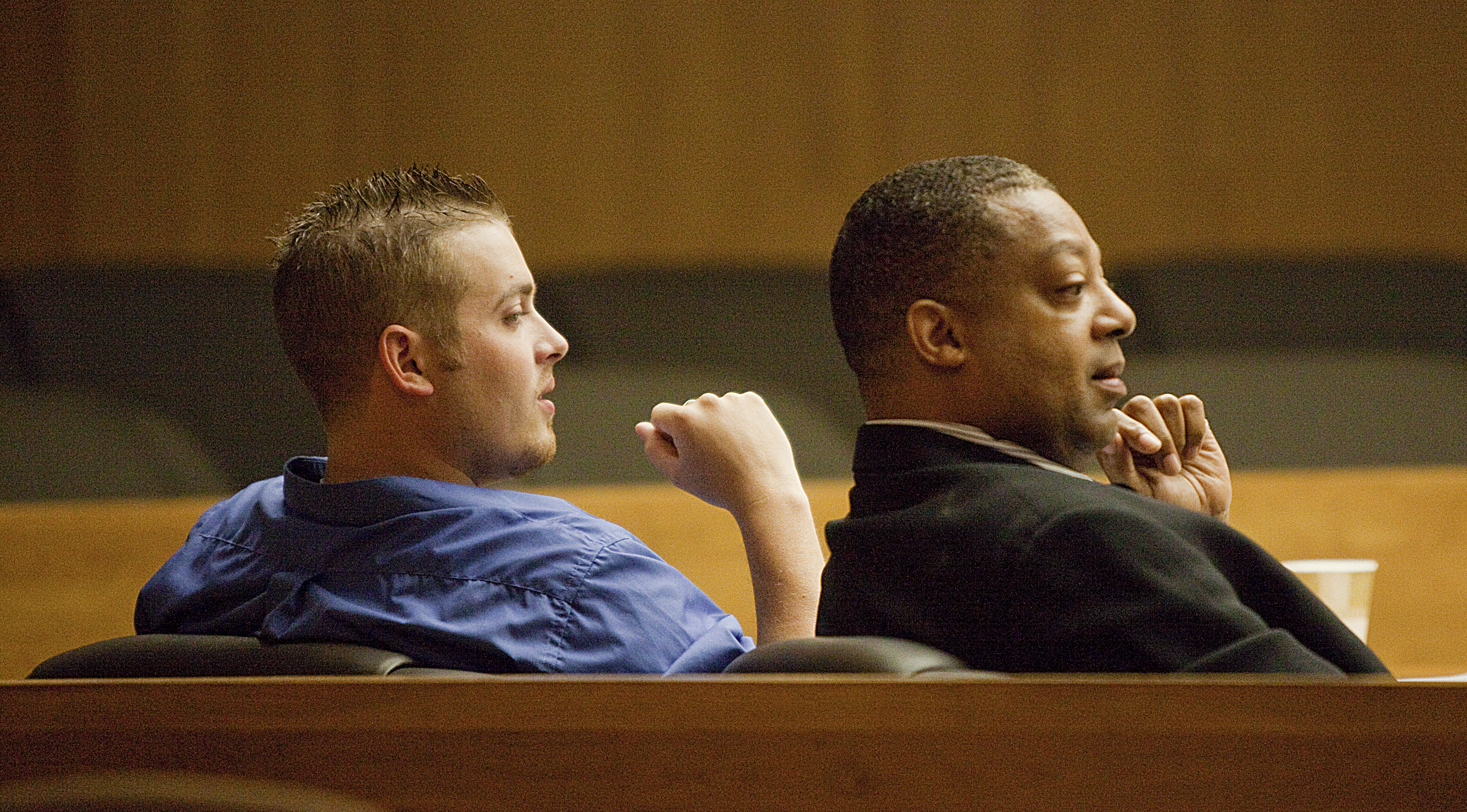 From left, defendant Chris Windler and his lawyer Brian Johnson listen to opening statements Friday at a hearing in the city’s case against Club Axis, 821 Iowa. The city argued that the club violated a court order, and has therefore been operating illegally.