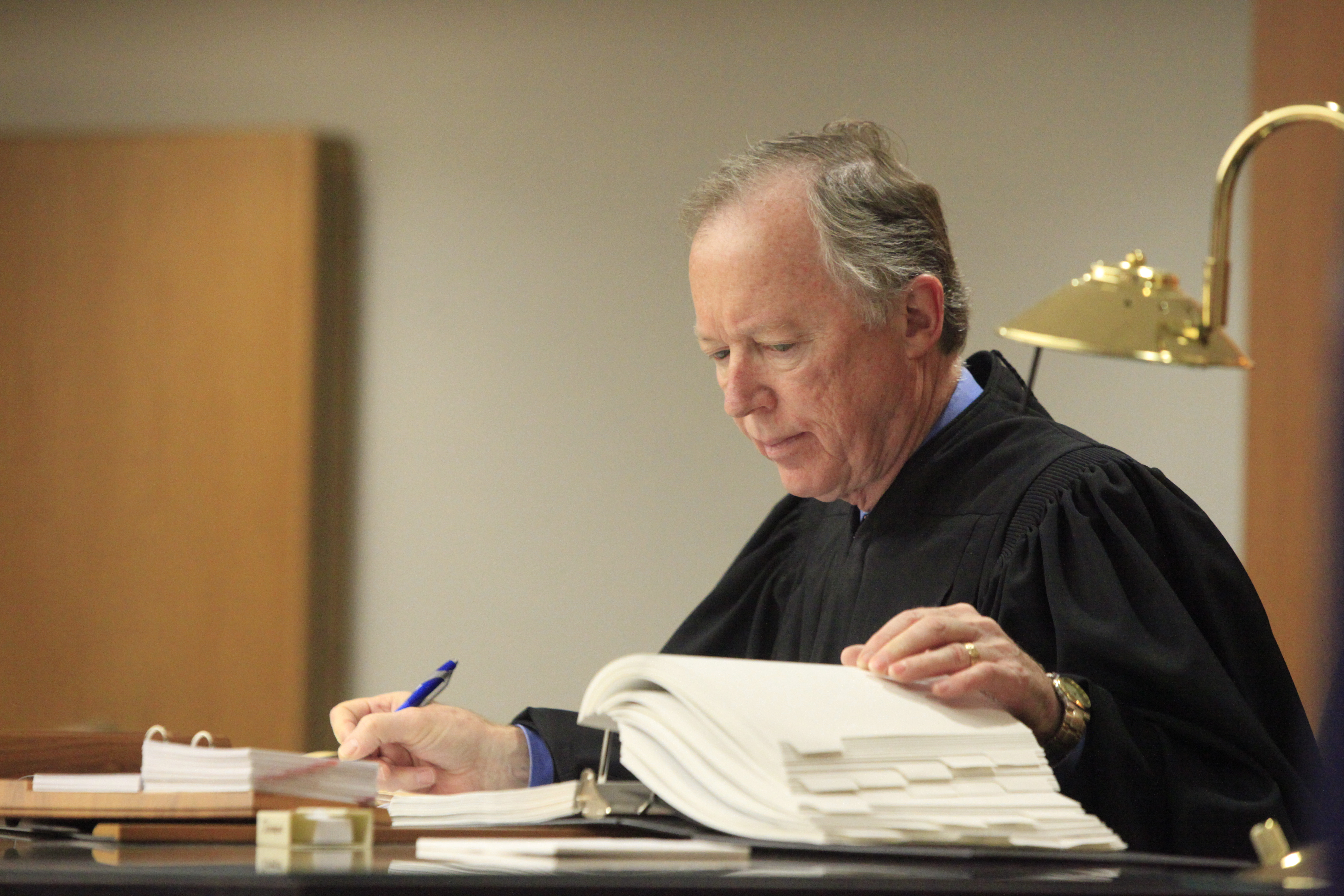 Judge Michael Malone looks over Lawrence city code in court Friday morning during a hearing with Club Axis and the city of Lawrence.