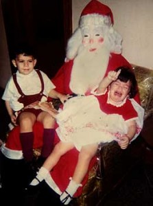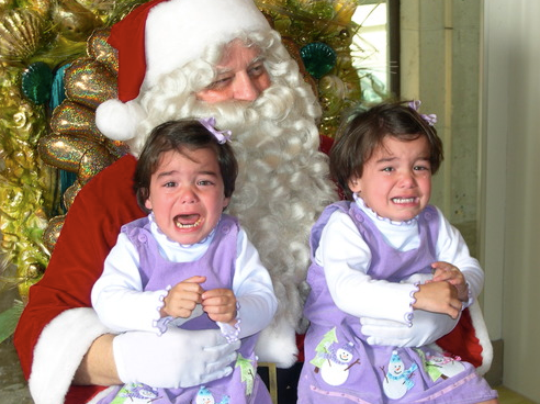 Favorite photos include a jovial Father Christmas with an identically dressed twin girl on each knee — both of whom are in sobbing hysterics. Another depicts a figure whose friendly beard and hat are augmented by a ghastly mask with black eye-slits and clown-like rouge. One commenter posts, “Oh dear God what is that thing?! It’s Michael Myers from “Halloween”! Hey Michael, WRONG HOLIDAY!!!”