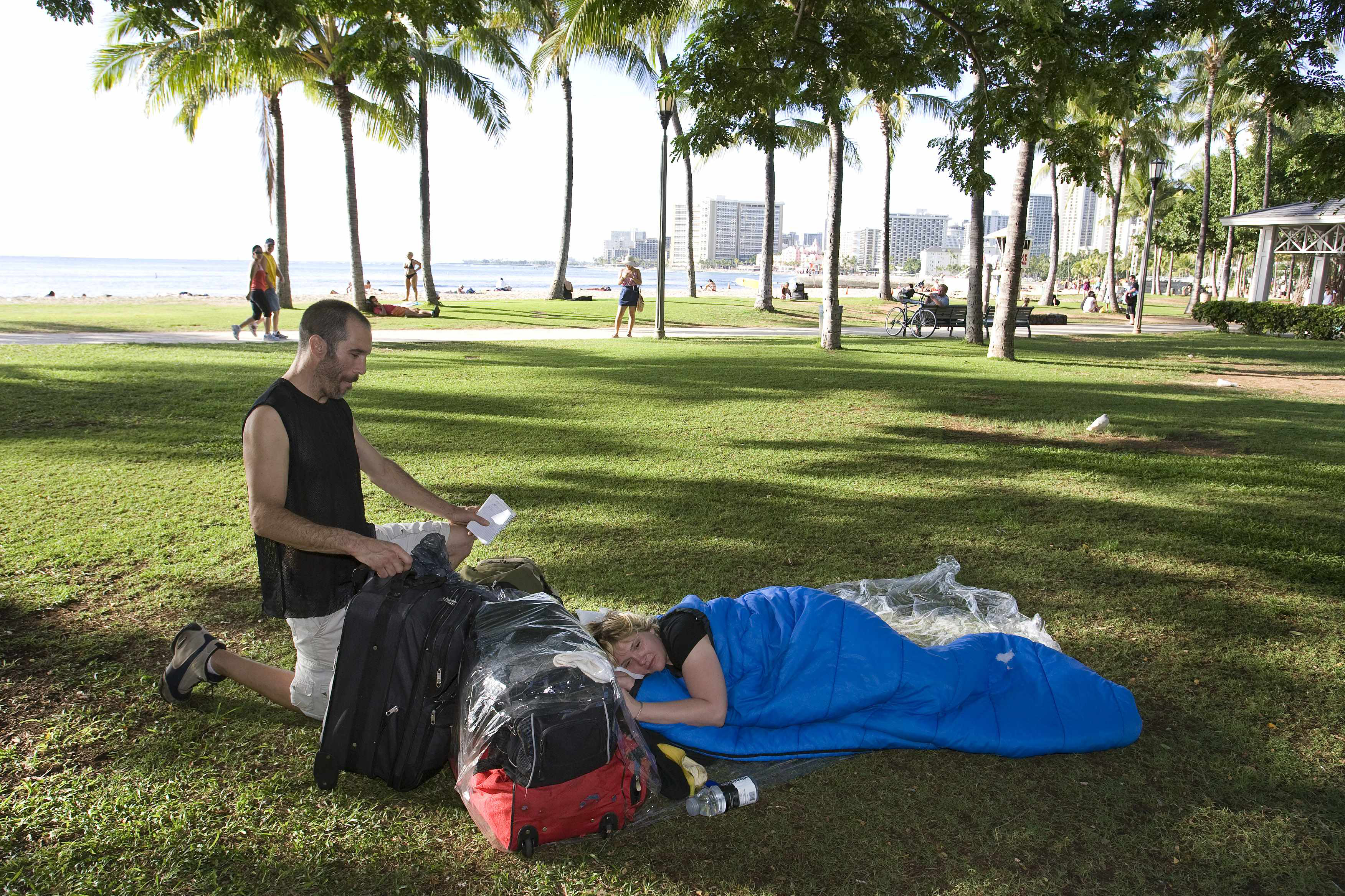 Dan Ernesto, left, looks for some important papers as his girlfriend, Kristen Jacobs, right, naps Friday at Kapiolani Park in Waikiki, Hawaii. Because of the bad economy on Oahu, many have lost their jobs and now find themselves homeless and living in the park.