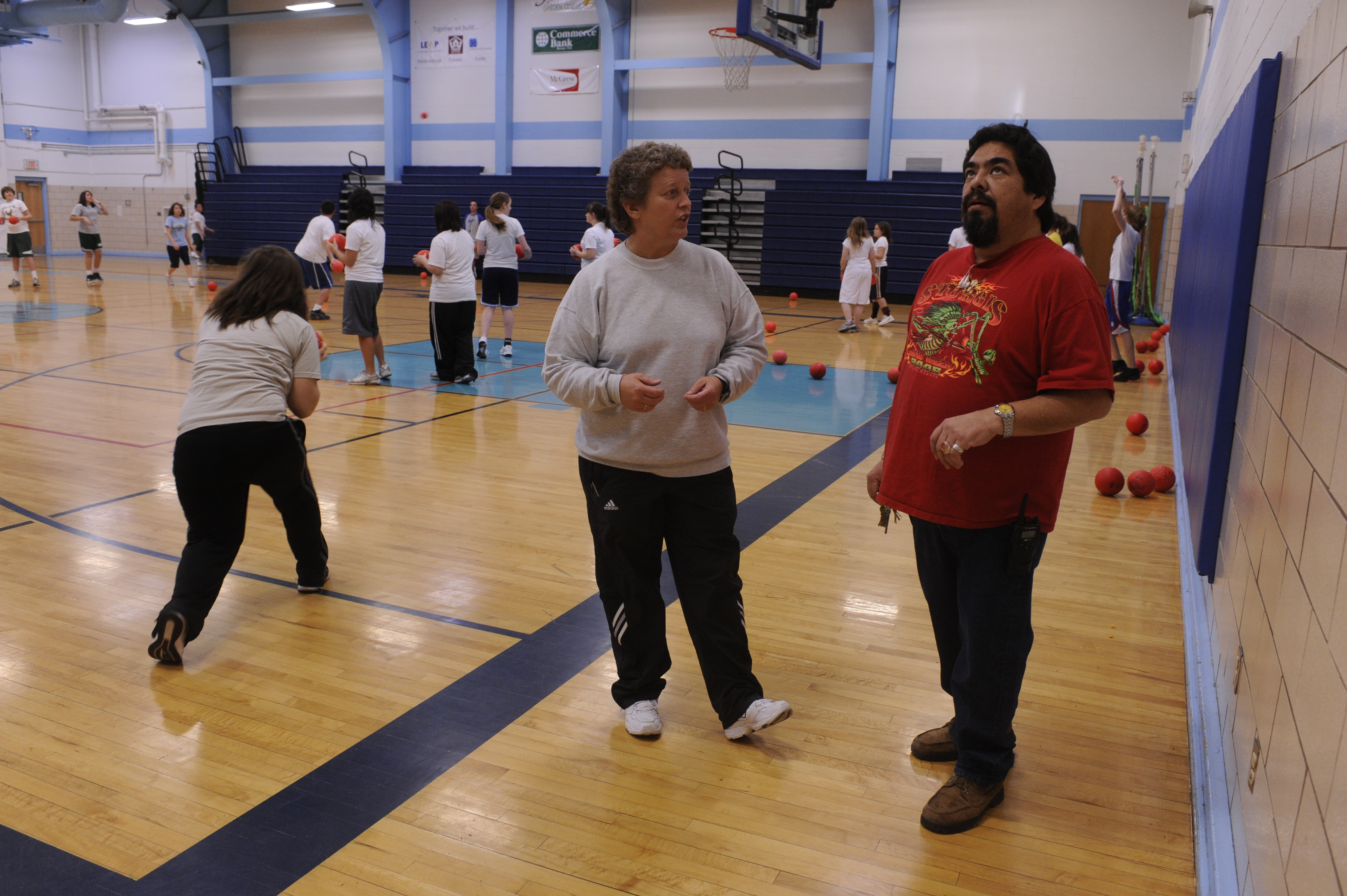 Julie Miller chats with James Ortiz, head custodian at West Junior High School, during a recent physical education class she was supervising. This is Ortiz’s first year as head custodian.