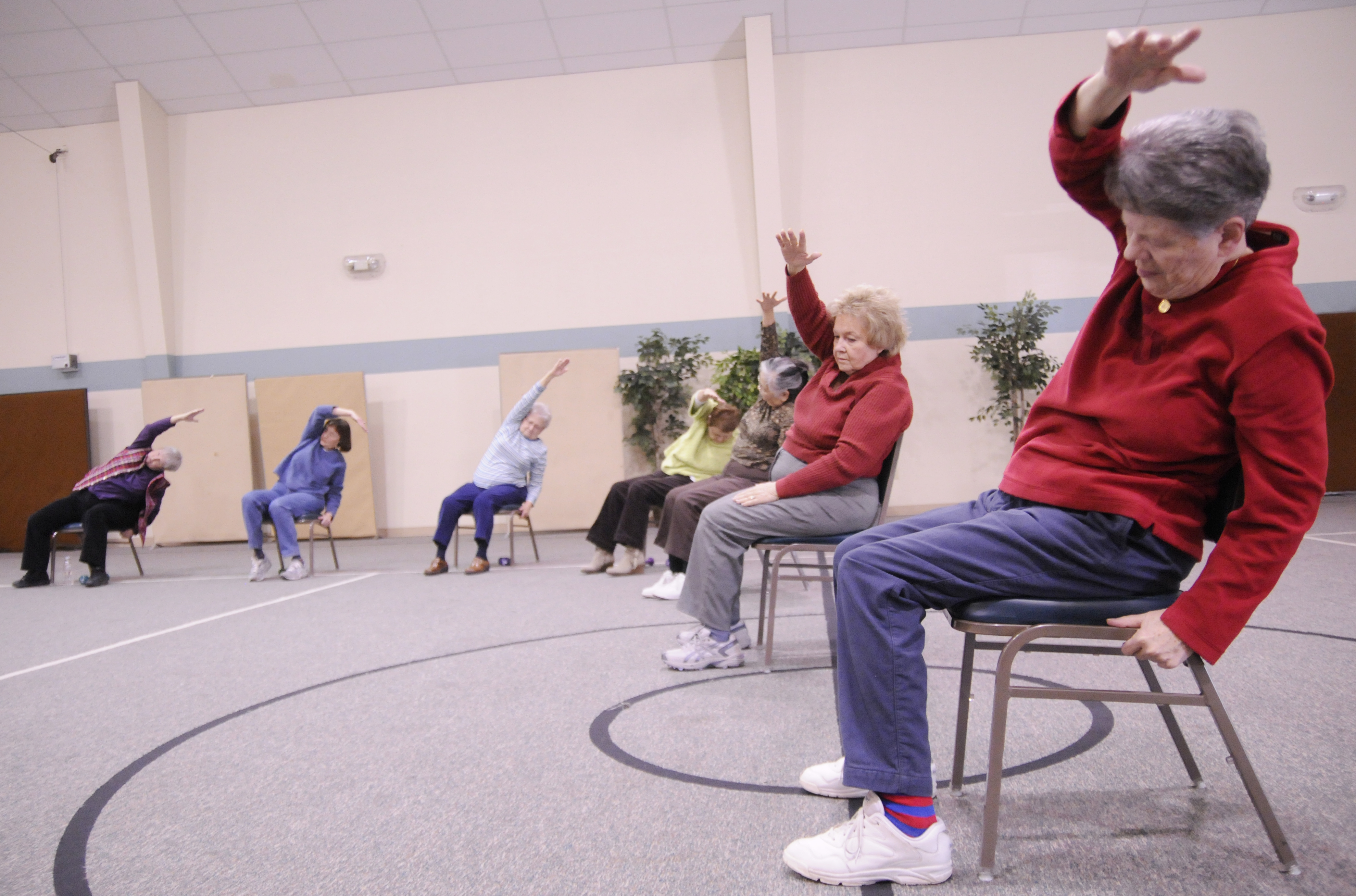 Beth Hart, foreground right, a member of the Welcome Club of Lawrence, leads members in a tai chi class earlier this month. Club members meet on Mondays and Thursdays for the class at First Baptist Church, 1330 Kasold Drive.