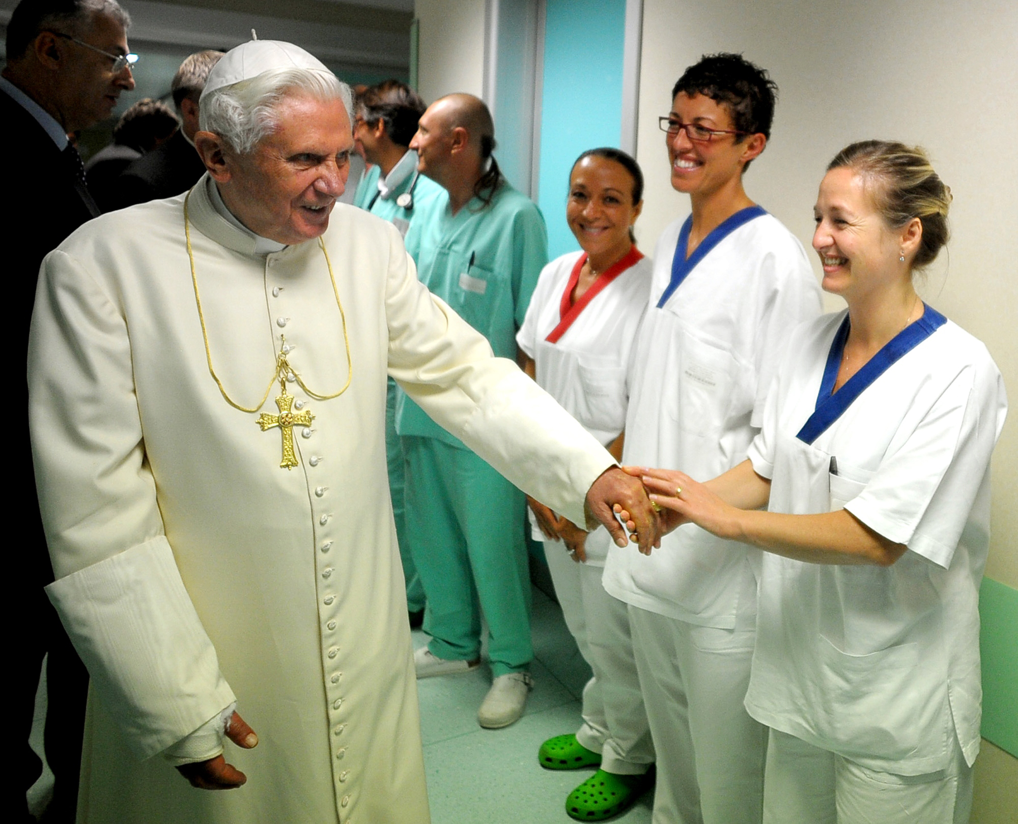 Pope Benedict XVI greets hospital staff as he leaves the regional hospital after a surgery on his right wrist, seen in a cast, in Aosta, northern Italy, in this photo provided by the Vatican newspaper L’Osservatore Romano. Benedict emerged smiling from the hospital Friday after undergoing surgery for a broken wrist due to a fall at his Alpine vacation chalet.