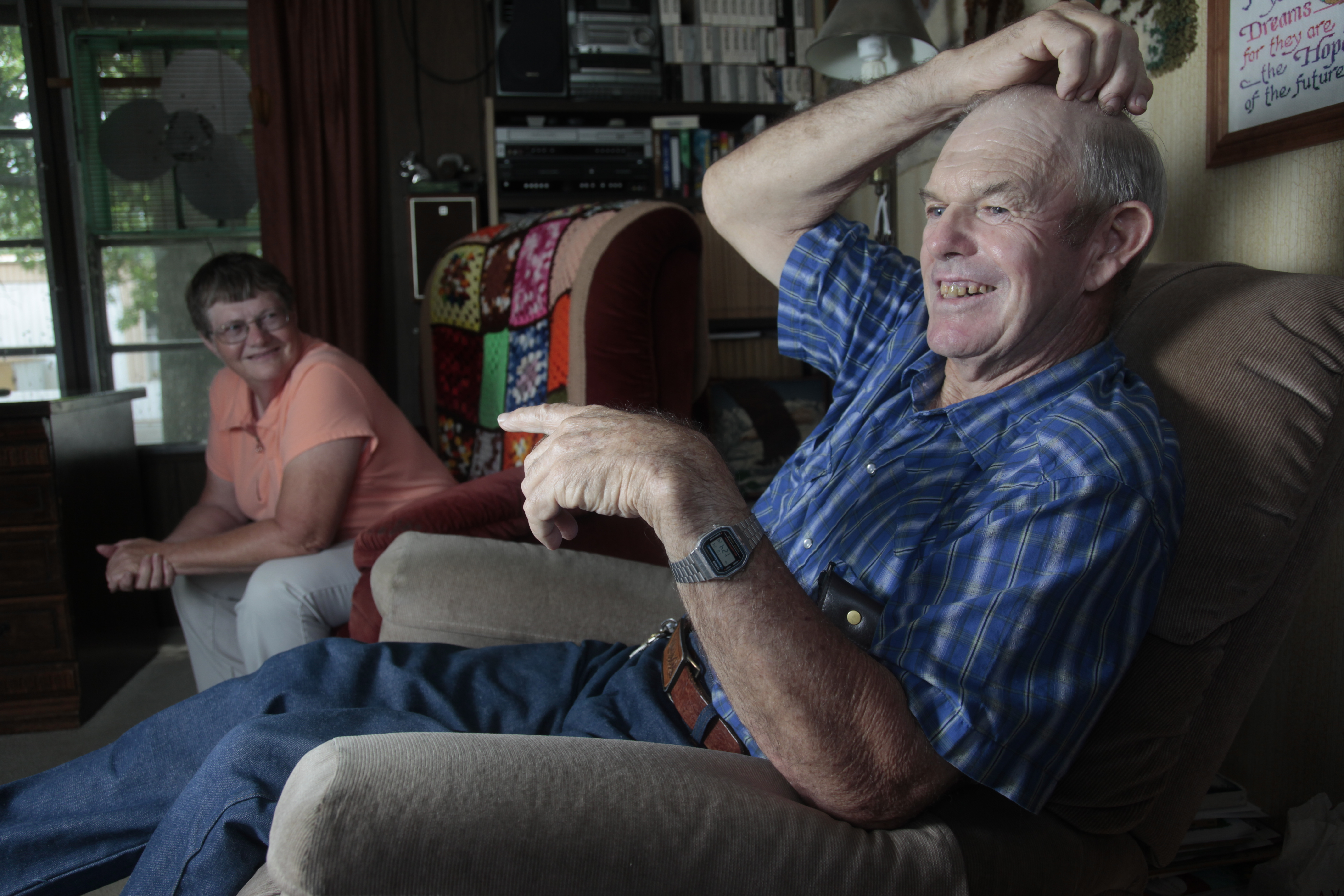 Dennis Jones, 69 Ottawa shares the story of his heart attack as his wife Vernas 65 listens. Jones was flown by air ambulance from Lawrence Memorial Hospital to St. Luke's in Kansas City, Mo., and eventually recovered after flat lining five times and was in a coma.