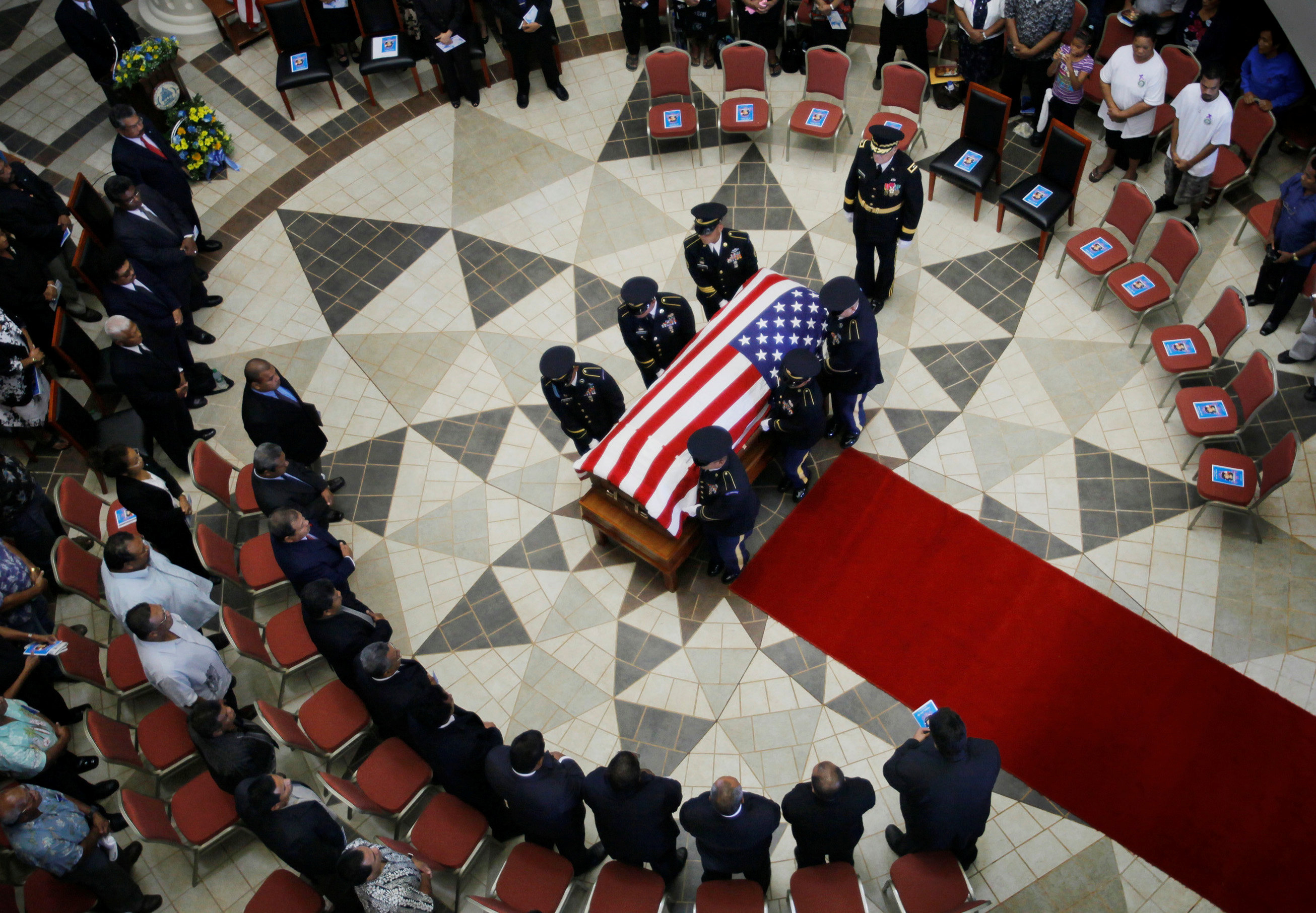 U.S. honor guards carry the coffin of Sgt. Jasper Obakrairur, 26, of Palau, during a funeral ceremony Tuesday at the Palau Capital building in Melekeok. Obakrairur is the first Palauan to be killed in Afghanistan under Operation Enduring Freedom.