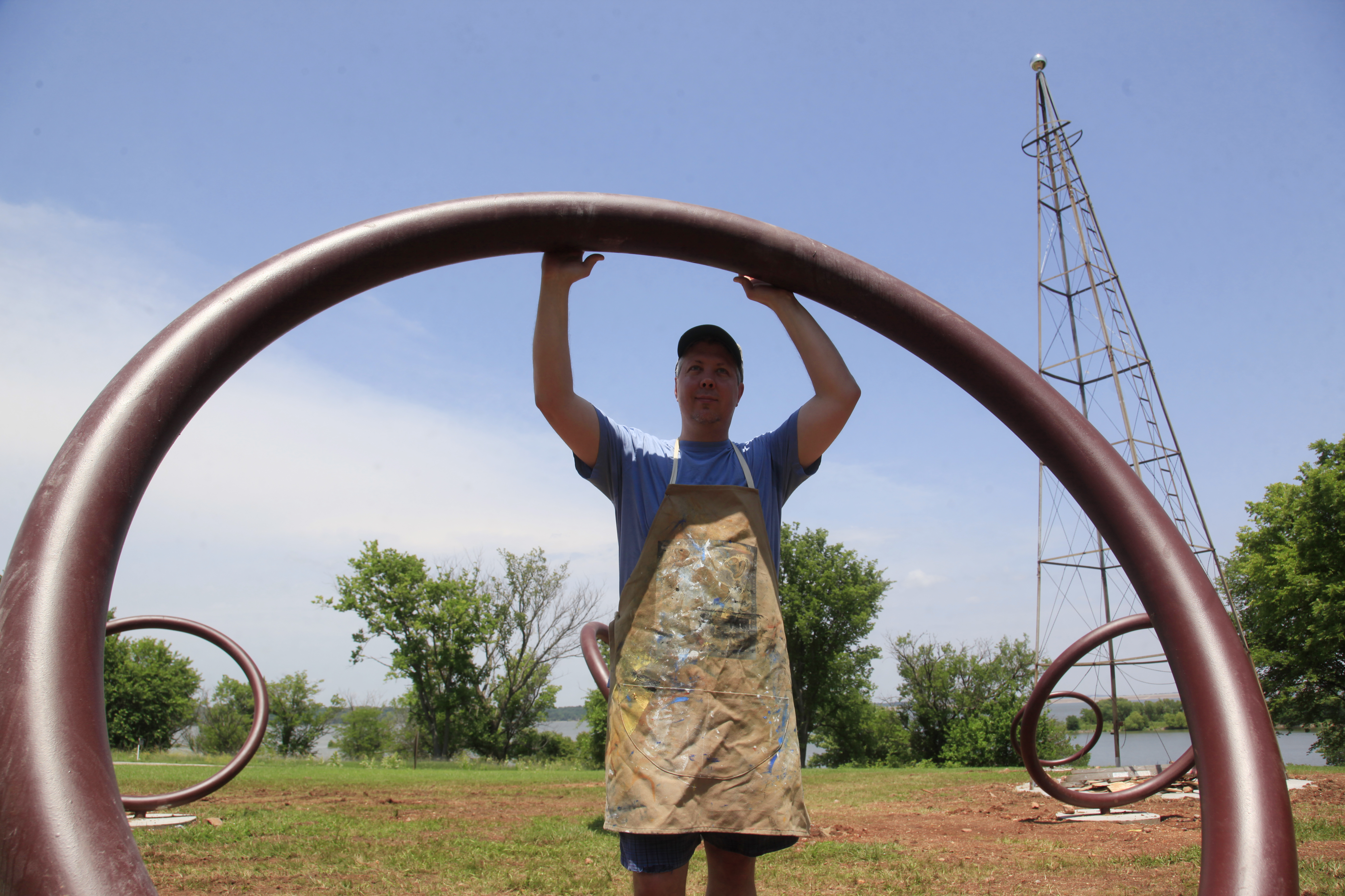 Stephen Johnson looks over his latest project called “Freedom Rings,” at the Wakarusa River Valley Heritage Museum. The sculpture, which was still yet to be painted, will serve as a beacon of light and symbol of freedom to represent the history of the region and the Underground Railroad.