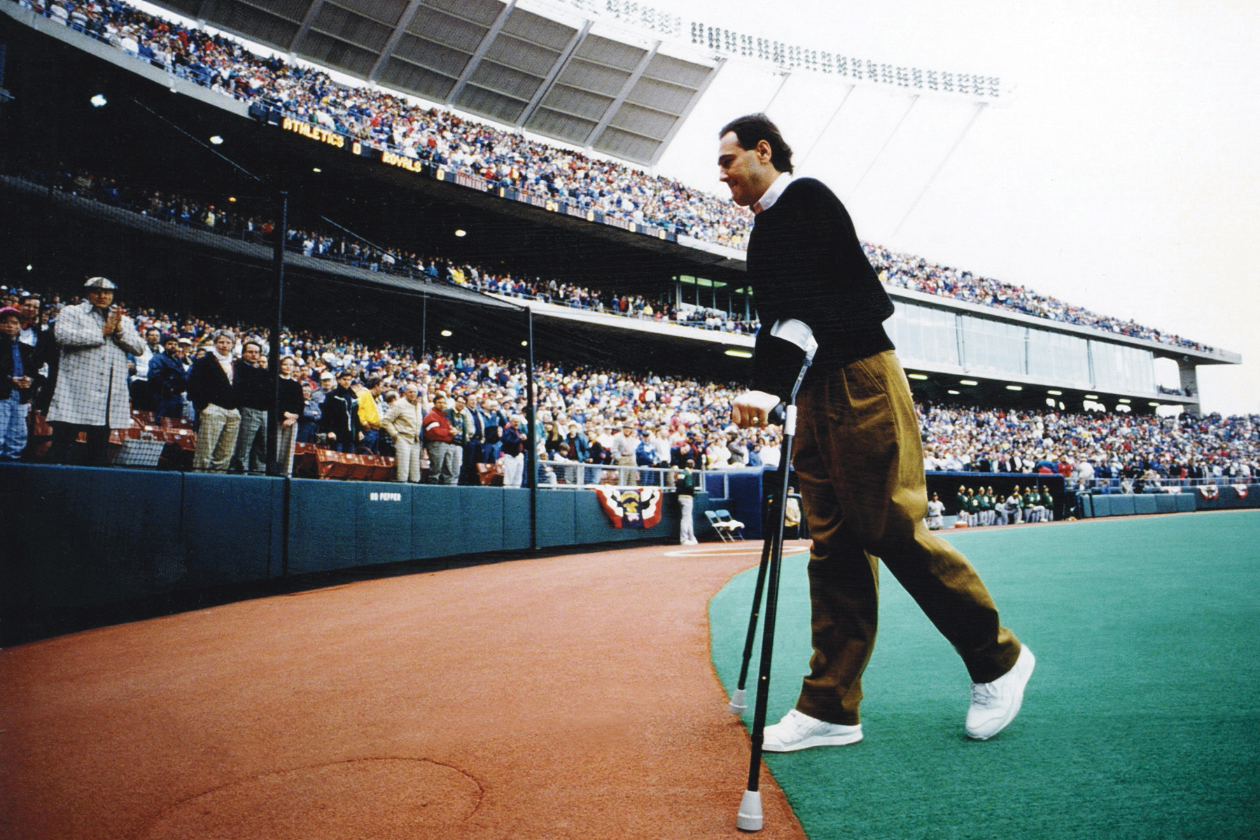 Former major league umpire Steve Palermo walks off the field after being honored for a night in 1991 in which he saved two women from muggers in Dallas. One of the muggers shot Palermo, leaving him with a spinal cord injury. Palermo, an Overland Park resident who worked as an MLB umpire for 15 years, is now able to walk with the help of a cane and one leg brace.
