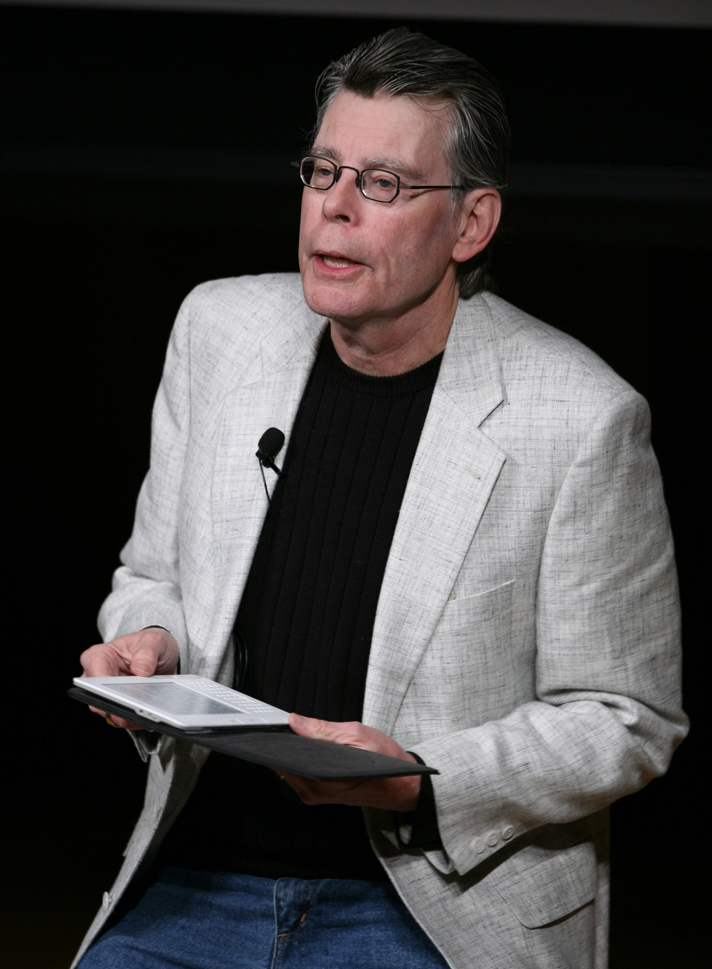 Stephen King reads from his book Ur with the Kindle 2 electronic reader at a news conference for Amazon.com in February.