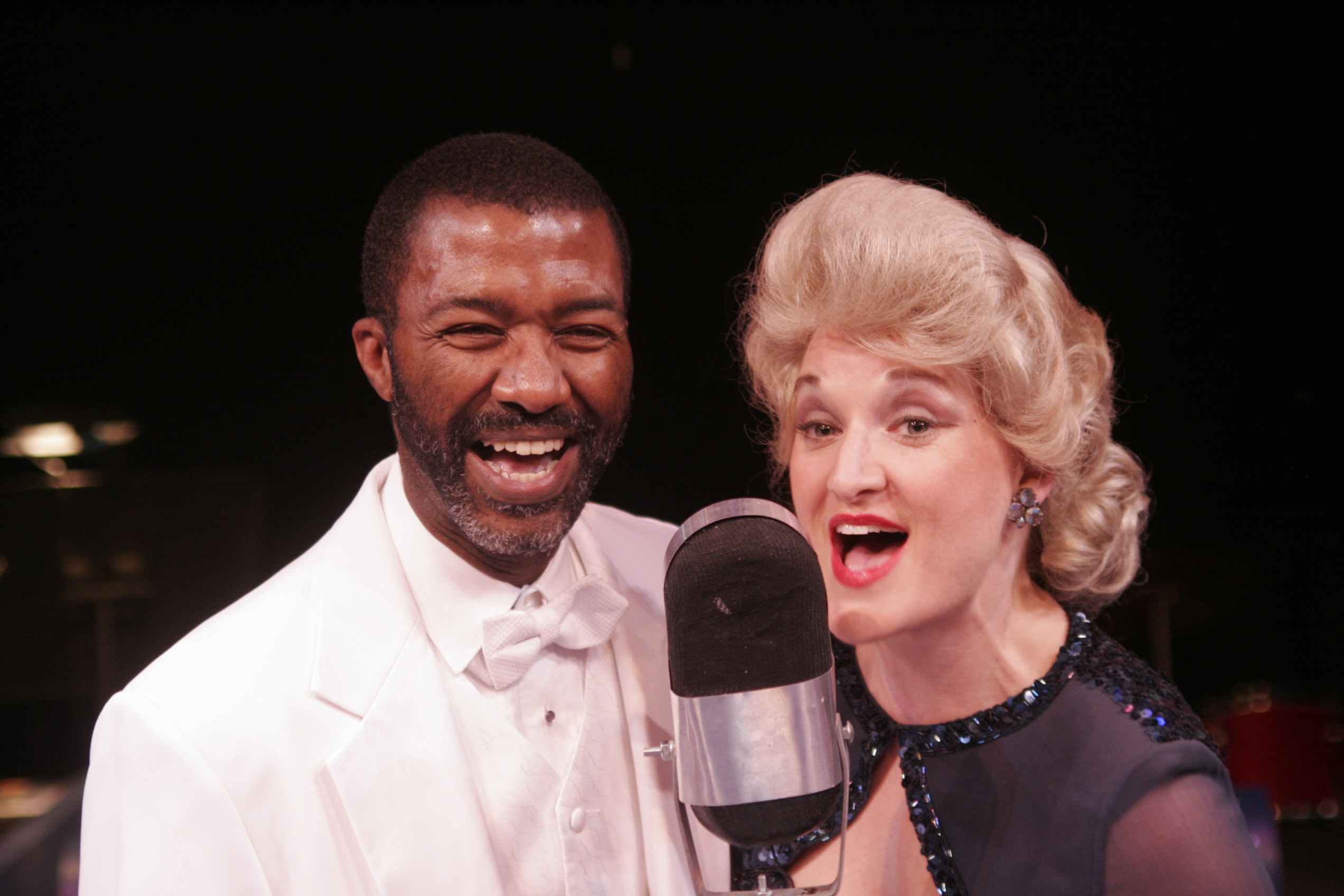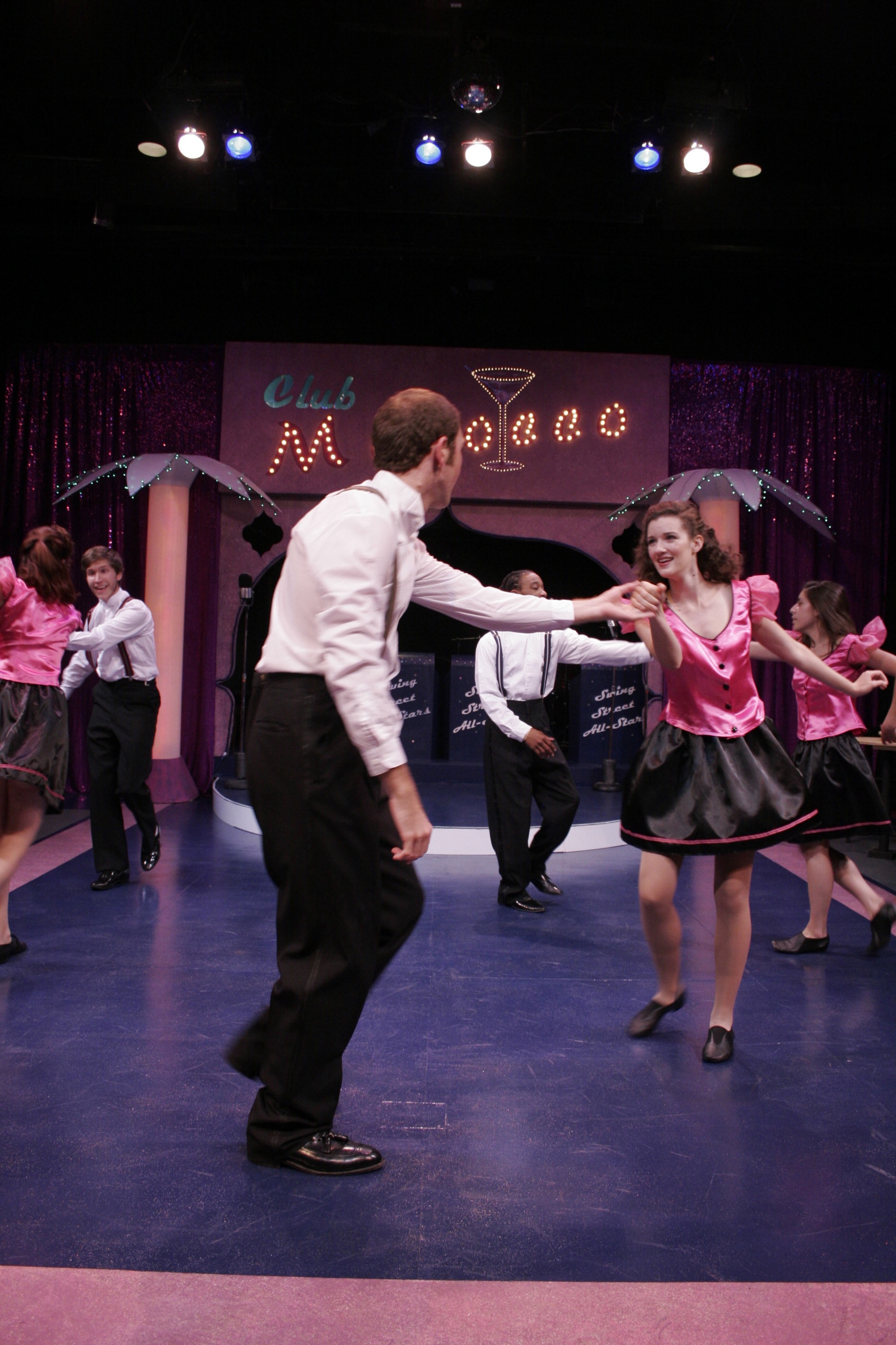 Butch Wilkerson, as Bobby LaRue, and Amy Reinert, as Velvet St. Regis, sing “Jump, Jive and Wail” as part of the Lawrence Community Theatre’s production of “Club Morocco.” The show also features a six-piece band and swing dancers.