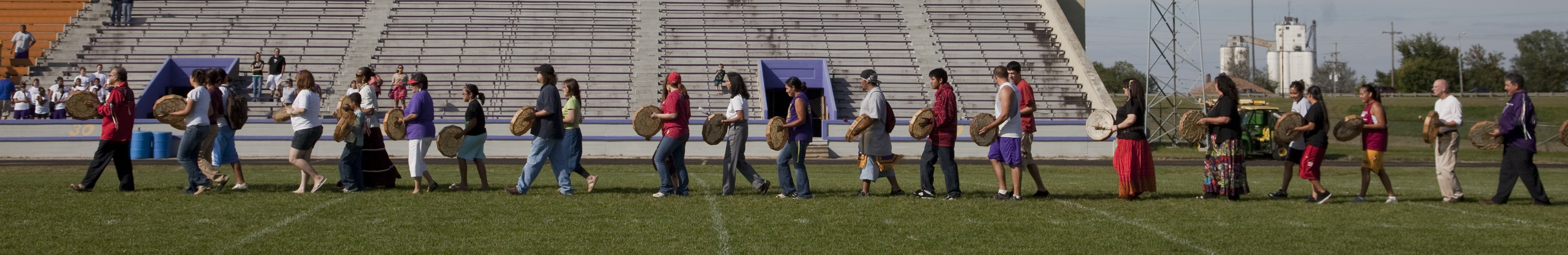 A line of drummers enter Haskell Stadium to open the anniversary celebration.