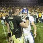 Colorado quarterback Tyler Hansen congratulates a dejected Todd Reesing after the Buffaloes' 34-30 win over the Jayhawks Saturday, Oct. 17, 2009 at Folsom Field.