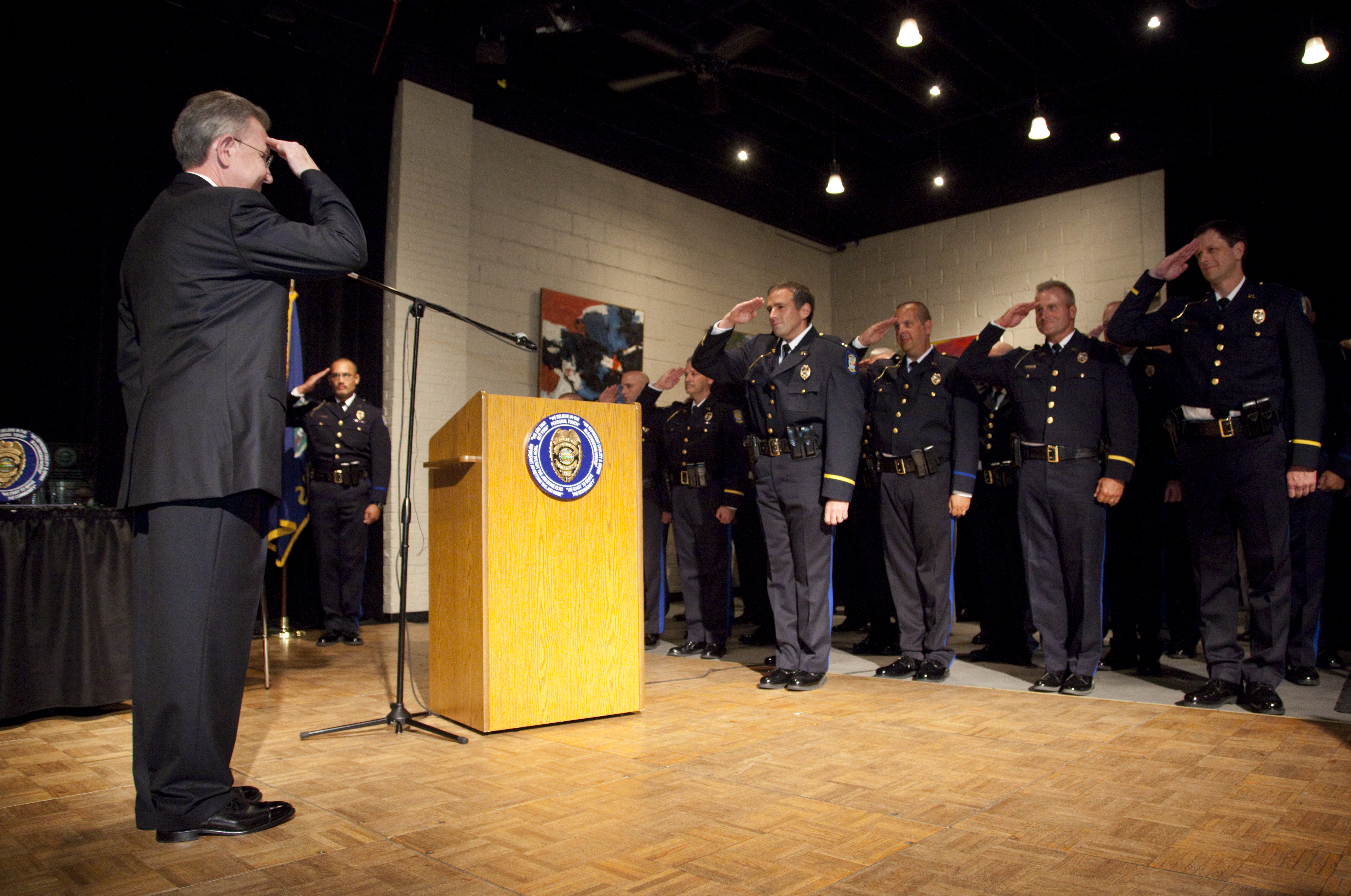 Lawrence police chief Ron Olin returns a salute from officers of the Lawrence Police Department during his retirement ceremony at Macelli's on Thursday, Aug. 26, 2010. Various law enforcement representatives, local leaders, friends and family came to wish Olin well in his retirement and thank him for his 39 years of service to the LPD. Olin will retire at the end of the month.