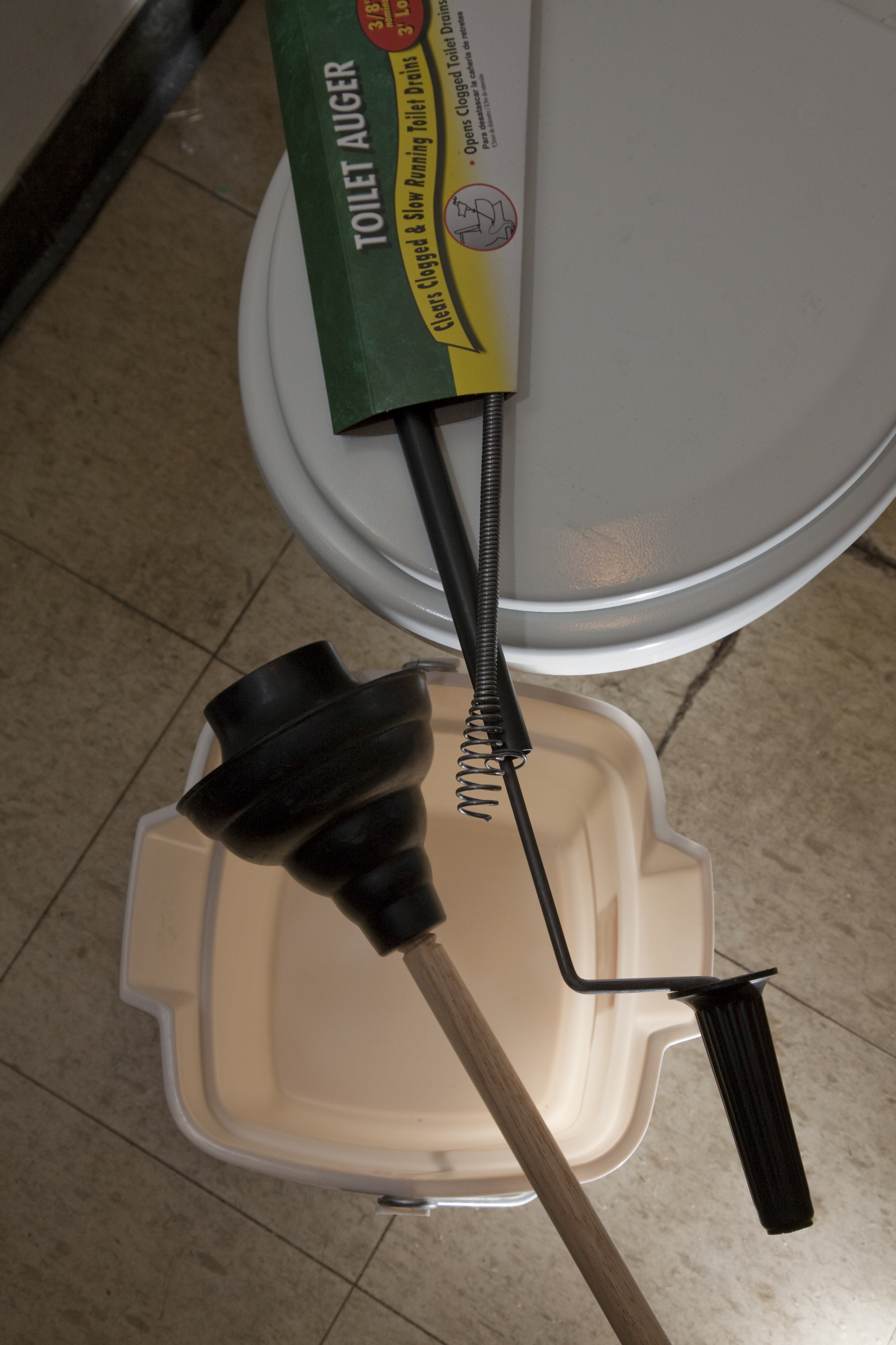 Step 4: If the toilet is still clogged after plunging and pouring warm water into the stool, it is time to invest in a toilet drain auger. These augers are about 3 feet in length with a curved shaft, a flexible cable and a crank handle. They are readily available at your local hardware store or home center.