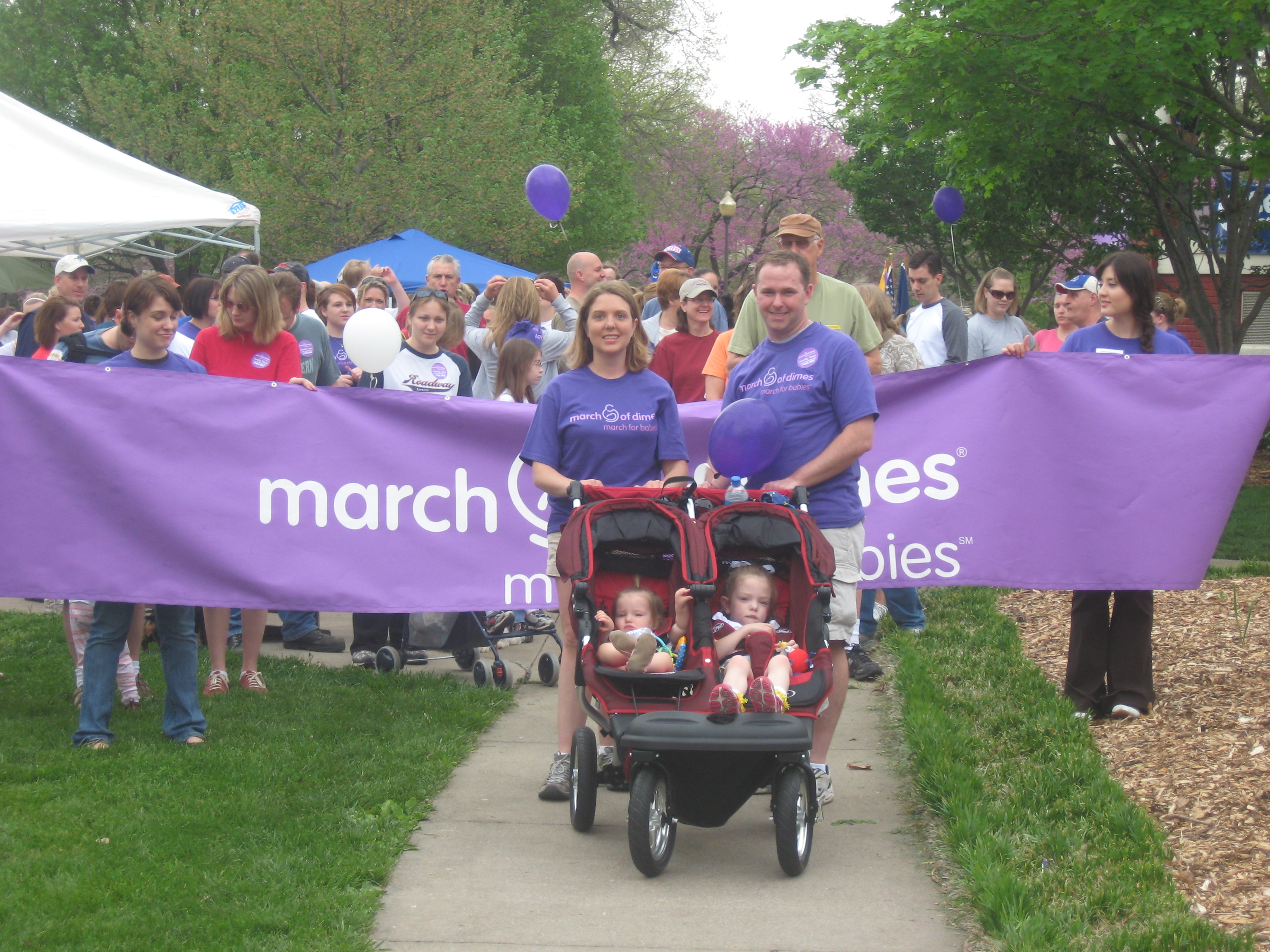 Cassandra and Matt Elwell, Lawrence, get ready to lead the March for Babies Walk in downtown Lawrence. They were the co-chairs of the 2009 event, which raised 2,000 for the March of Dimes. They walked in memory of their first daughter, Grace, and in honor of their second daughter, Campbell, who is in the stroller at right. Also, in the stroller is Campbell's little sister, Paige.
