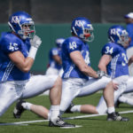 From left, Kansas university linebackers Justin Springer (45), Drew Dudley (49) and Huldon Tharp (34) stretch out during the beginning of a spring practice on April 5 at the KU practice fields. Expectations have risen with fall practice starting just four weeks before KU's season opener.