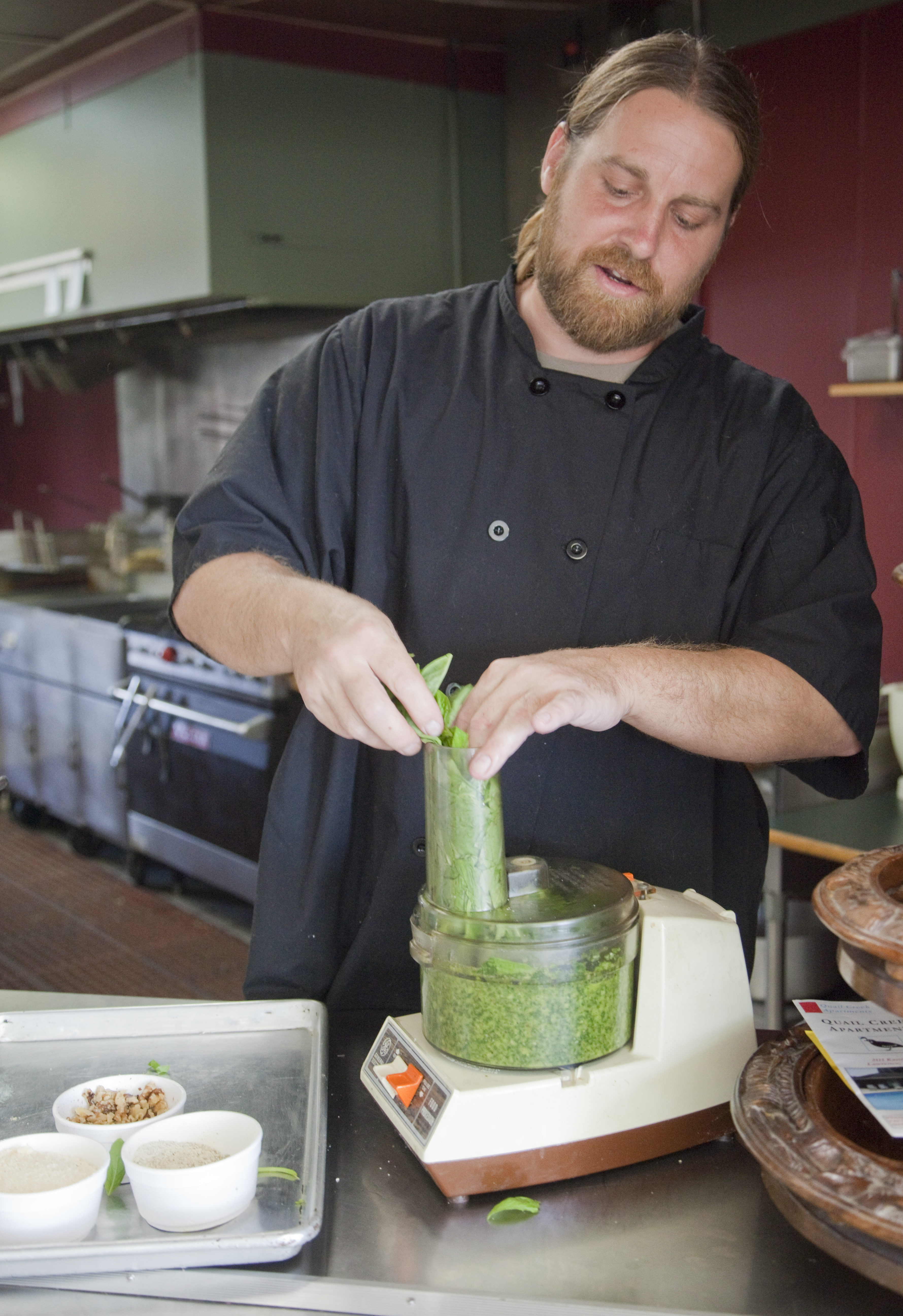 Mike Yoder/Journal-World Photos Chef Bradley Walters, owner of Basil Leaf Cafe, presses a couple of pounds of basil leaves into a mixer to make a recipe of pesto at the restaurant.