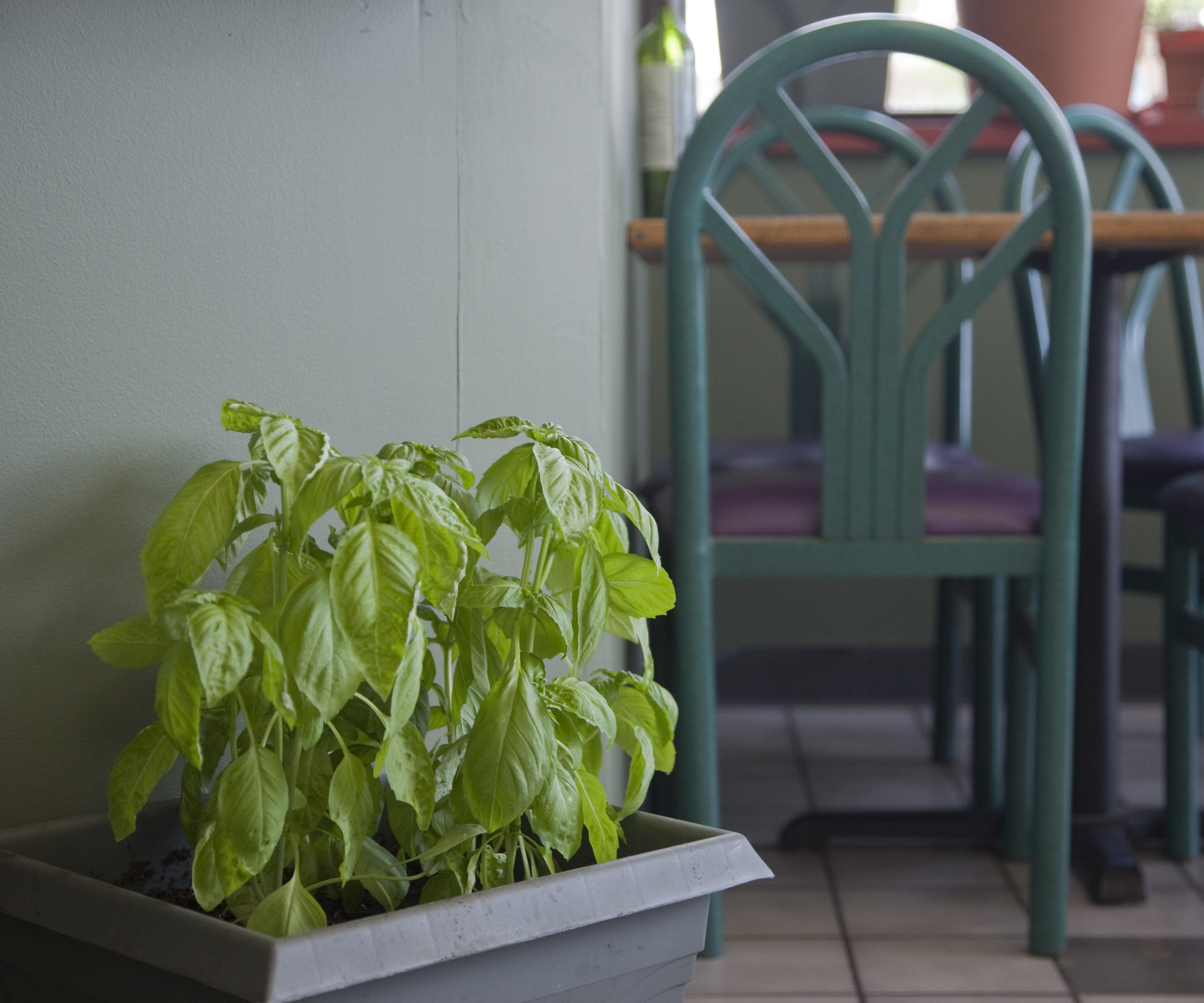 A planter of Genovese basil plant decorates the dinning area of the Basil Leaf Cafe, 3300 W. Sixth St.