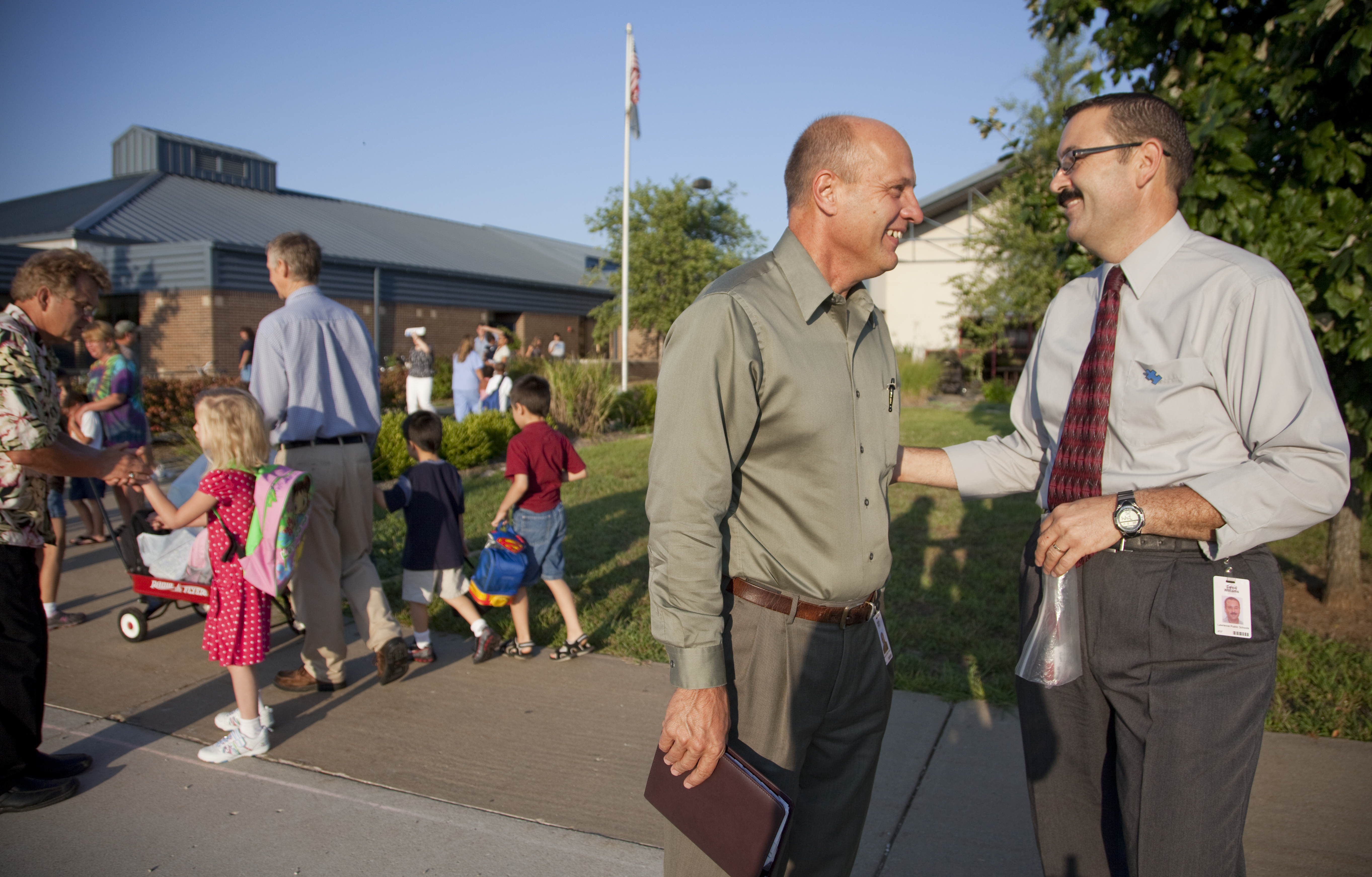 Prairie Park School principal David Williams, far right, greets new Lawrence school superintendent Rick Doll on the first day of school Aug. 12, 2009. Doll just completed his first year as USD 497 superintendent.