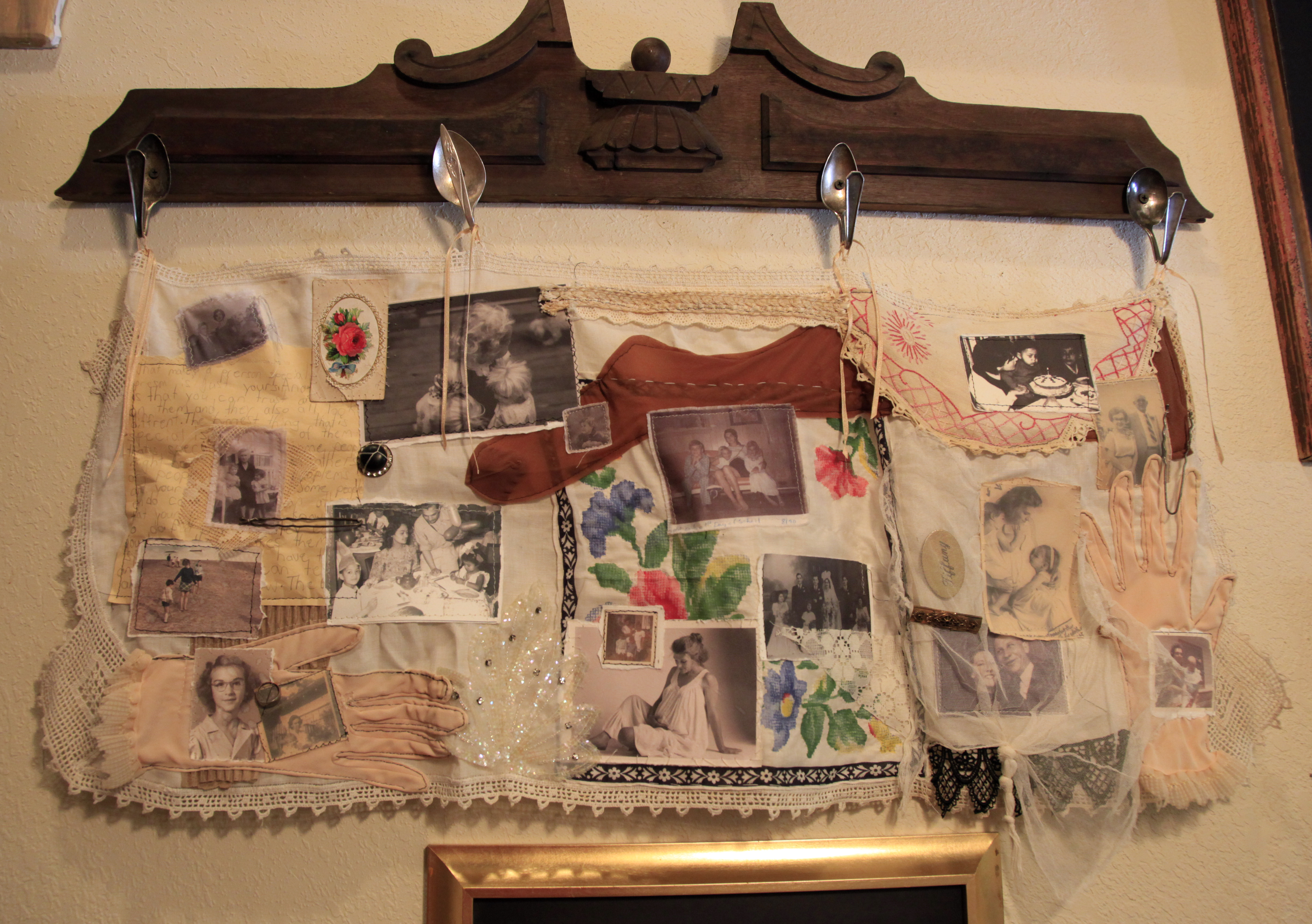 The walls of the stairwell are covered with the new pieces created since graduating early, from self-portrait photos to mixed-media collages.
