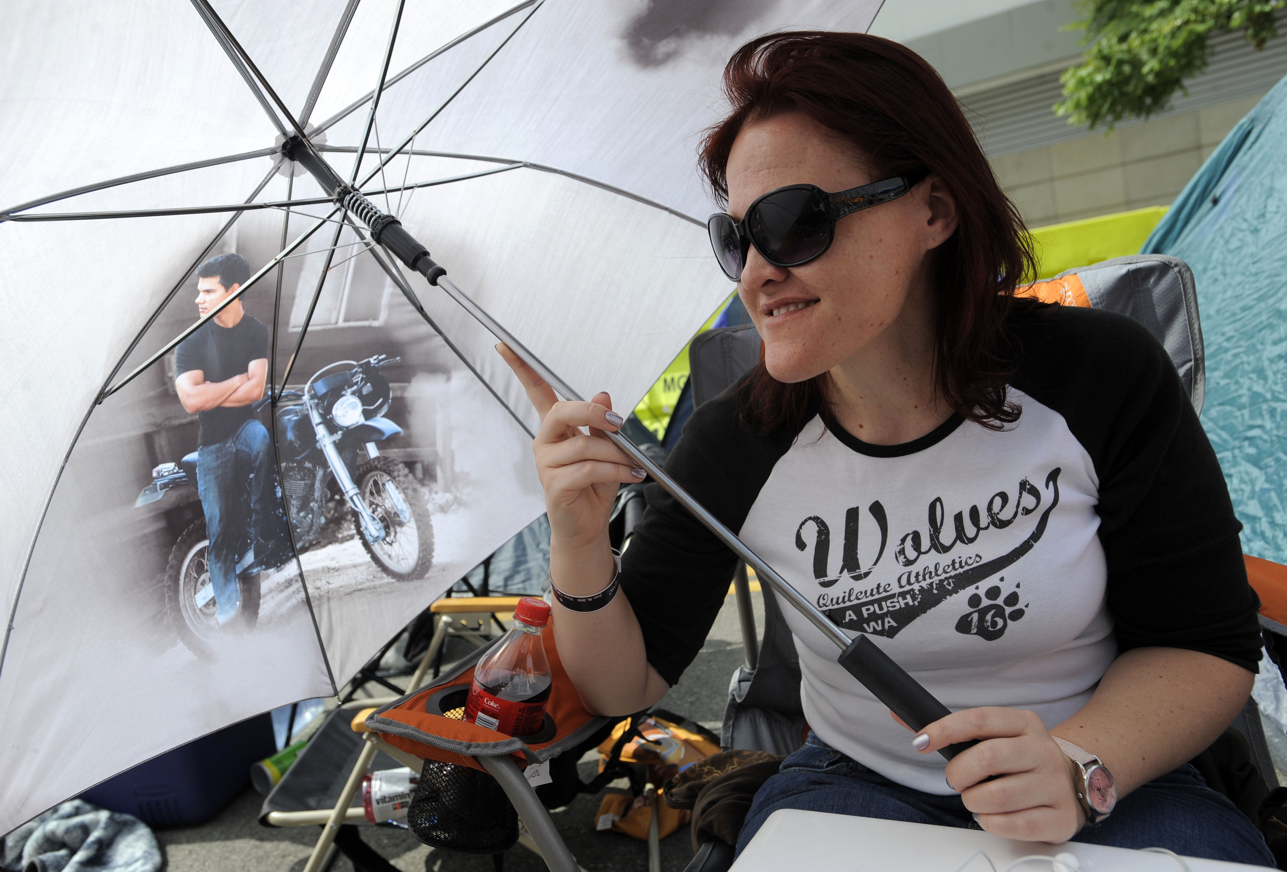 “Twilight” fan Shannon Winnett, of Fresno, Calif., who aligns herself with “Team Jacob,” sits underneath a Taylor Lautner umbrella as she waits Wednesday for Thursday’s “The Twilight Saga: Eclipse” premiere in Los Angeles.