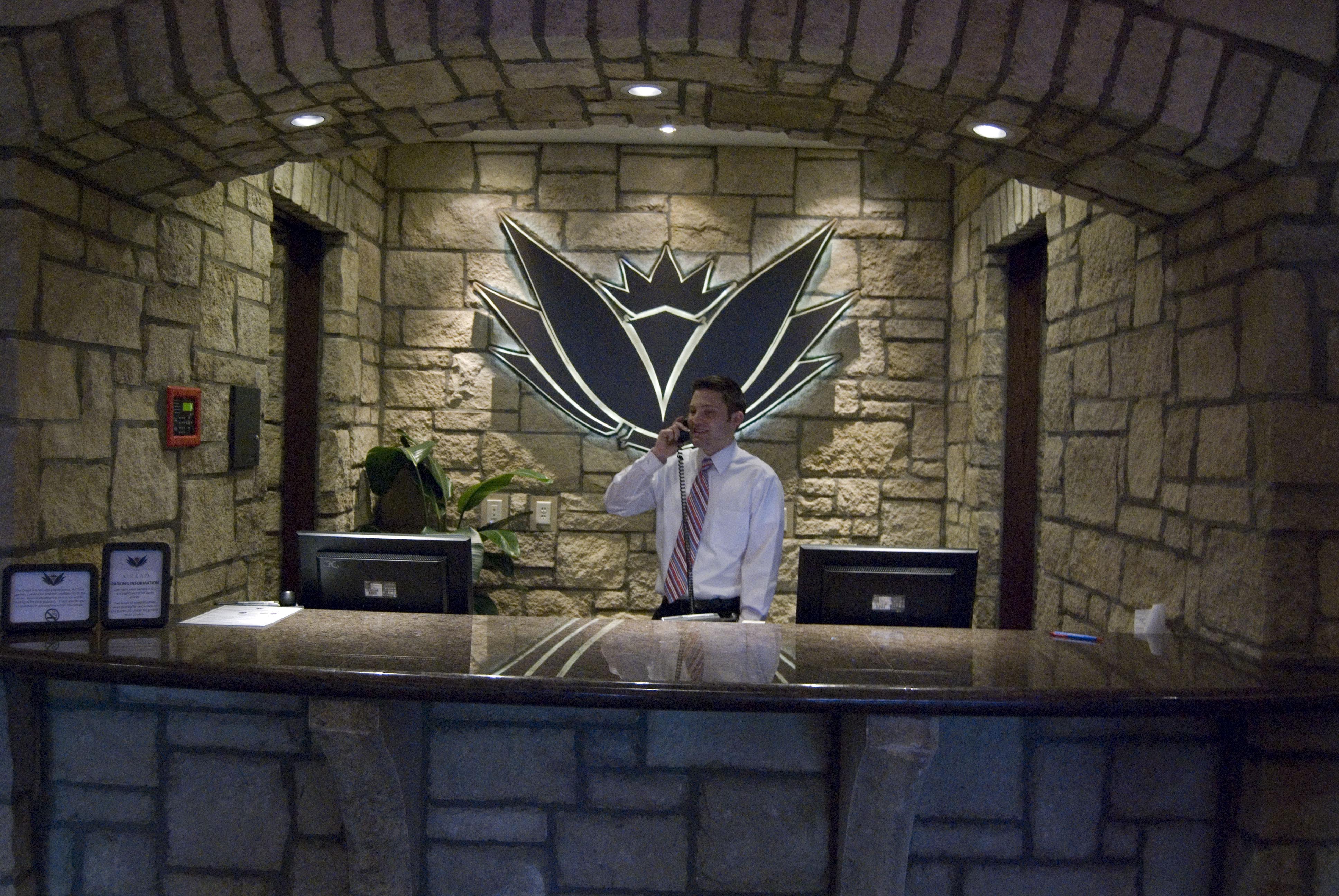 Handsomely tufted furniture in textured fabrics and leather offer seating that is both comfortable and stylish. The lobby offers a brick barreled ceiling and polished concrete floors. Lighting runs the gamut from rustic, bronze-hued chandeliers to contemporary cubed glass pendants. An abundance of windows capitalize on unprecedented views of neighboring Memorial Stadium.