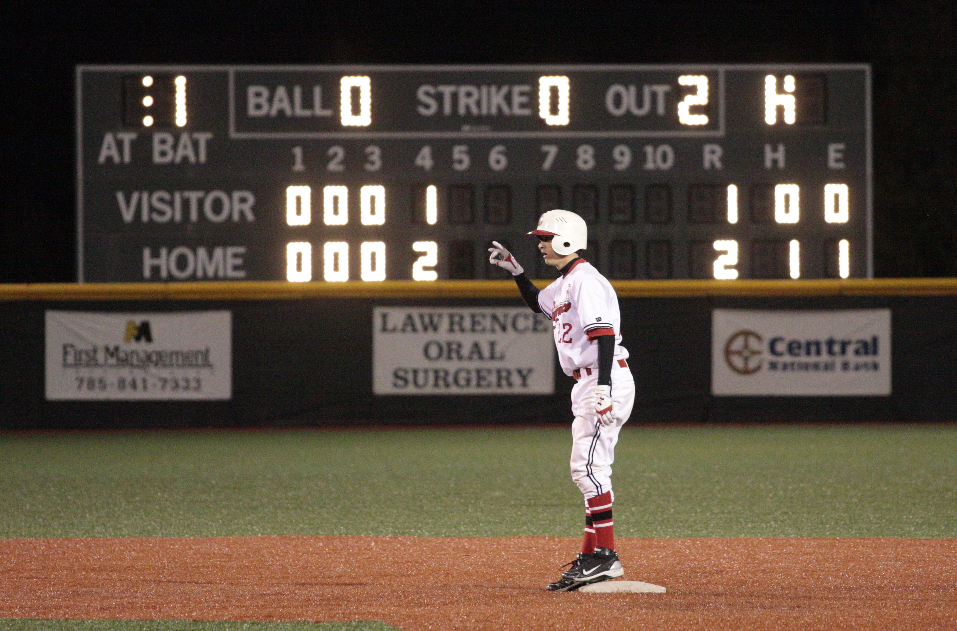 Lions center-fielder Ross Johnson stands at second base after hitting a two-run double in the fourth inning against Blue Springs, MO., South Friday at the Free State field.