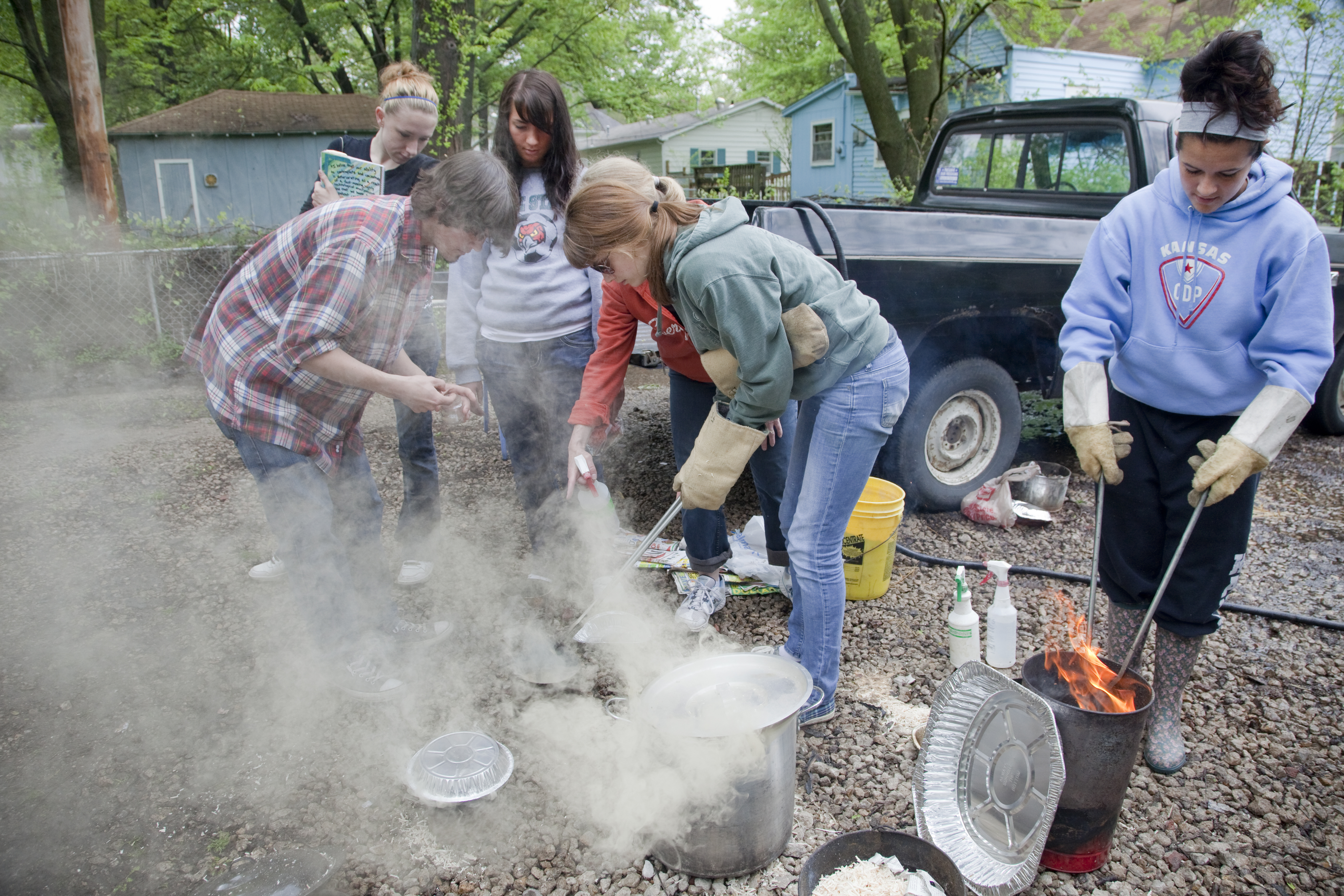 Lawrence and Free State high school students participate in a raku firing at the home of Dave Leach. The students were placing their raku pieces in containers filled with miscellaneous items set on fire that will create random and unpredictable textures and colors on their pottery.