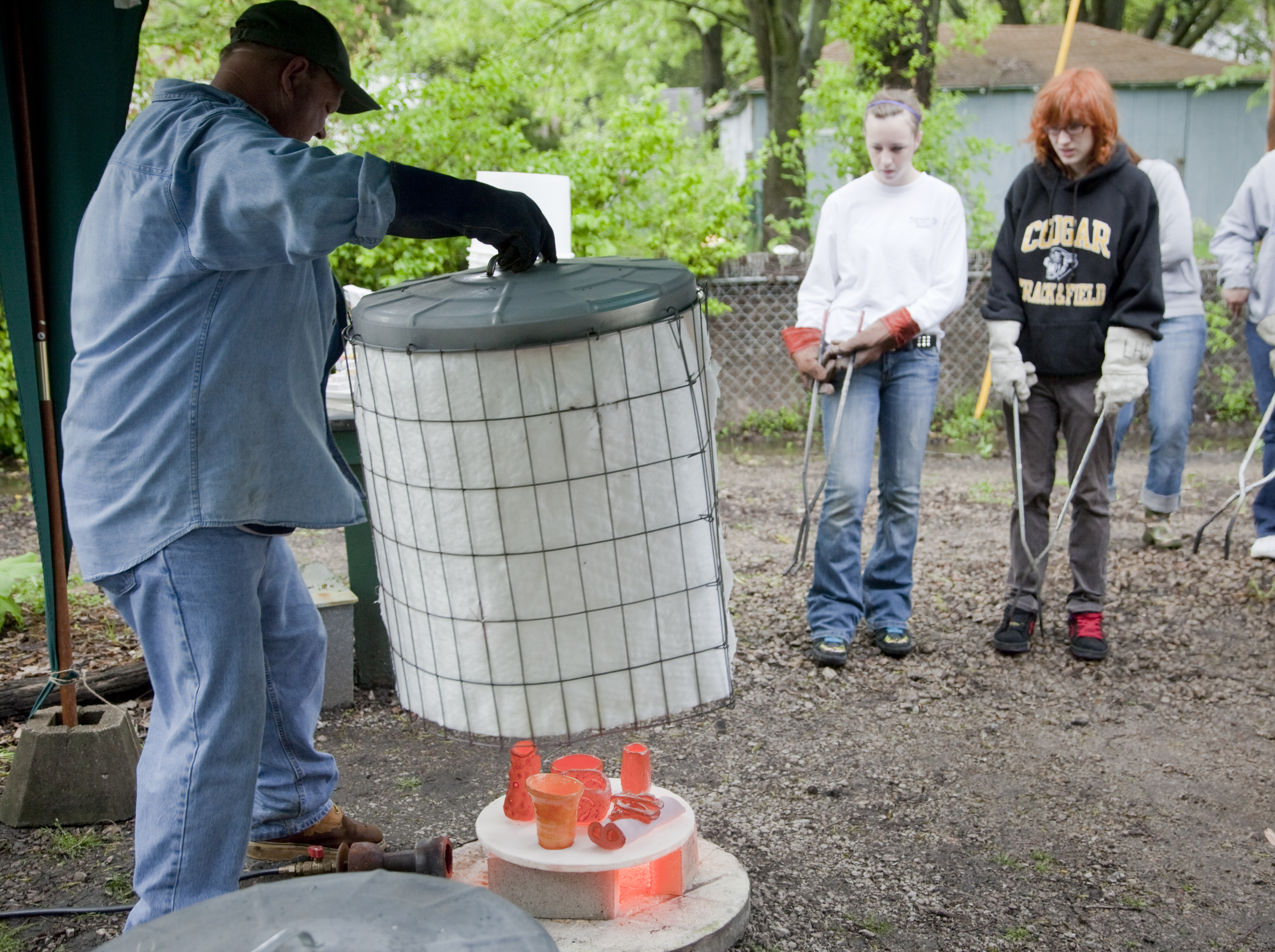 Wearing thick, protective gloves that climb up to his elbows, David Johnson, 17, grips a long pair of metal tongs and picks up a piping-hot ceramic vase. He then shuffles over to a cluster of coffee cans and cooking pots, releases the tong’s pincers and plops the vase inside one of the cans. The can is filled with newspapers, sawdust, copper washers and coins. All of the combustibles burst into flames when the vase slides inside, and Johnson snaps a flimsy pie pan over the can, periodically flapping it to waft the smoke out and breathe oxygen into the mixture.