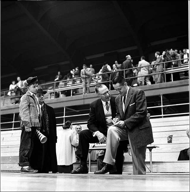 1950's: Phog Allen, former coach (center, in dark suit) talking with Dick Harp, (left) basketball coach at University of Kansas, in Lawrence, KS.