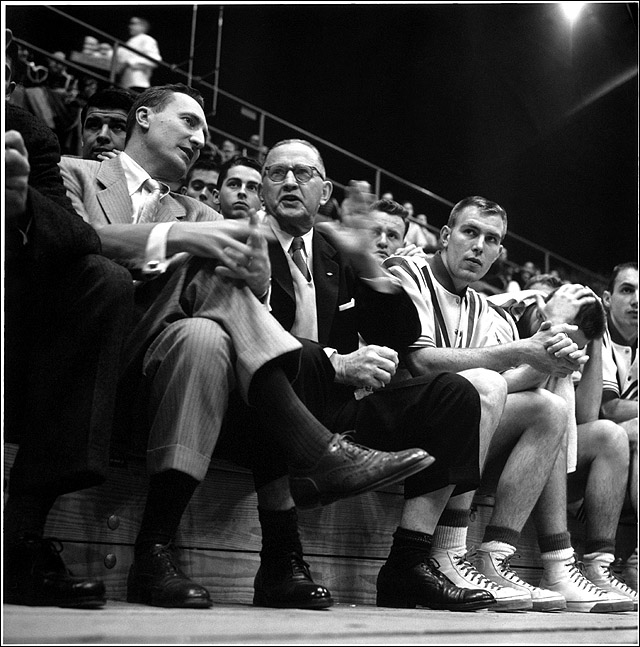 Kansas coach Dr. Forrest Phog Allen gives his final instructions to his team before playing -- and winning -- the 1952 NCAA men's basketball championship game in Seattle. KU defeated St. John's, 80-63, for the title. Future North Carolina coach Dean Smith (facing camera) was a junior at Kansas.