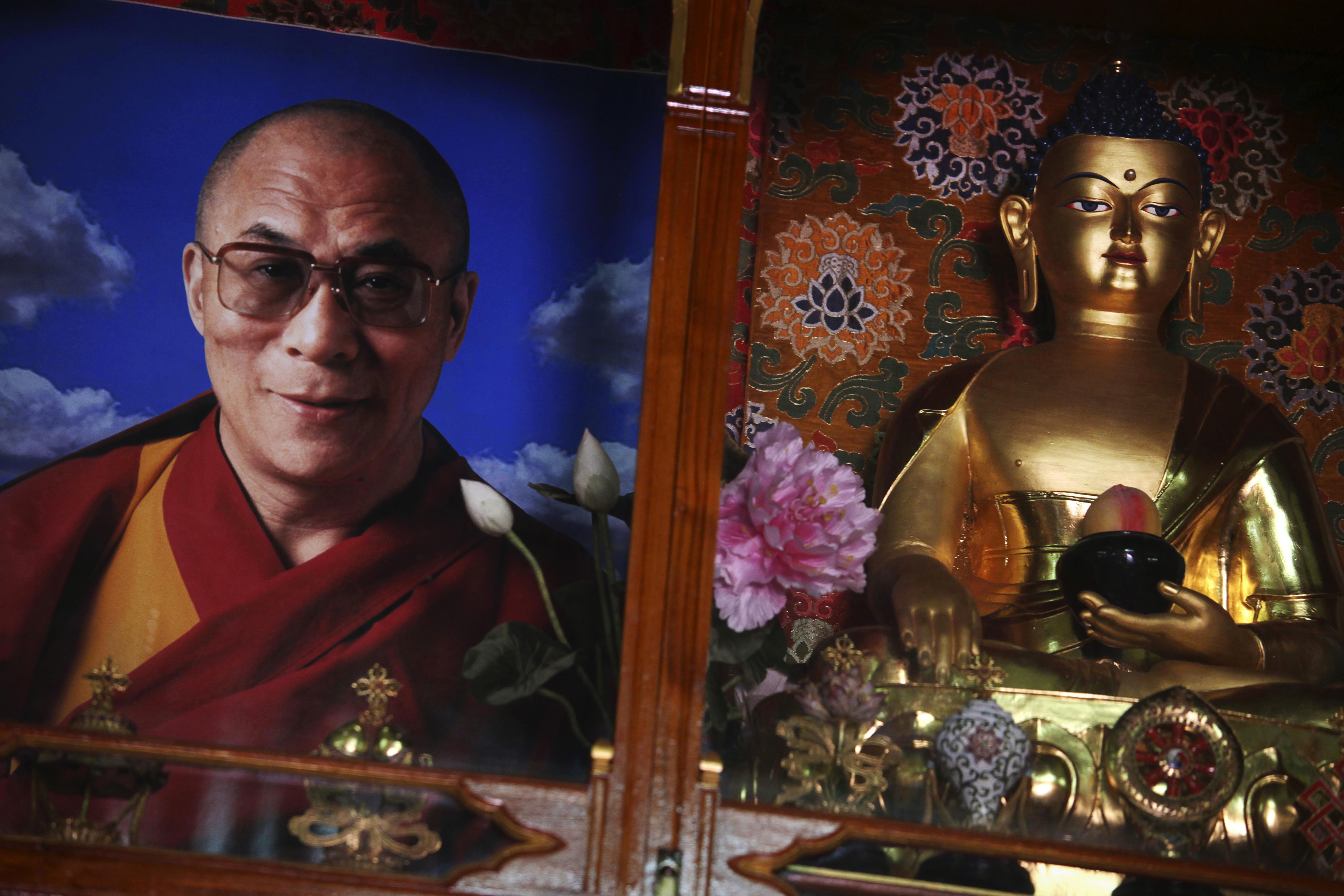 A photograph of Tibetan spiritual leader the Dalai Lama sits next to a statue of Buddha on May 10 at the Nechung Dorje Drayangling Monastery in Dharmsala, Himachal Pradesh, northern India. As the Dalai Lama, the center of the Tibetan exile movement approaches his 75th birthday, the question has become impossible to escape: What happens when he dies?