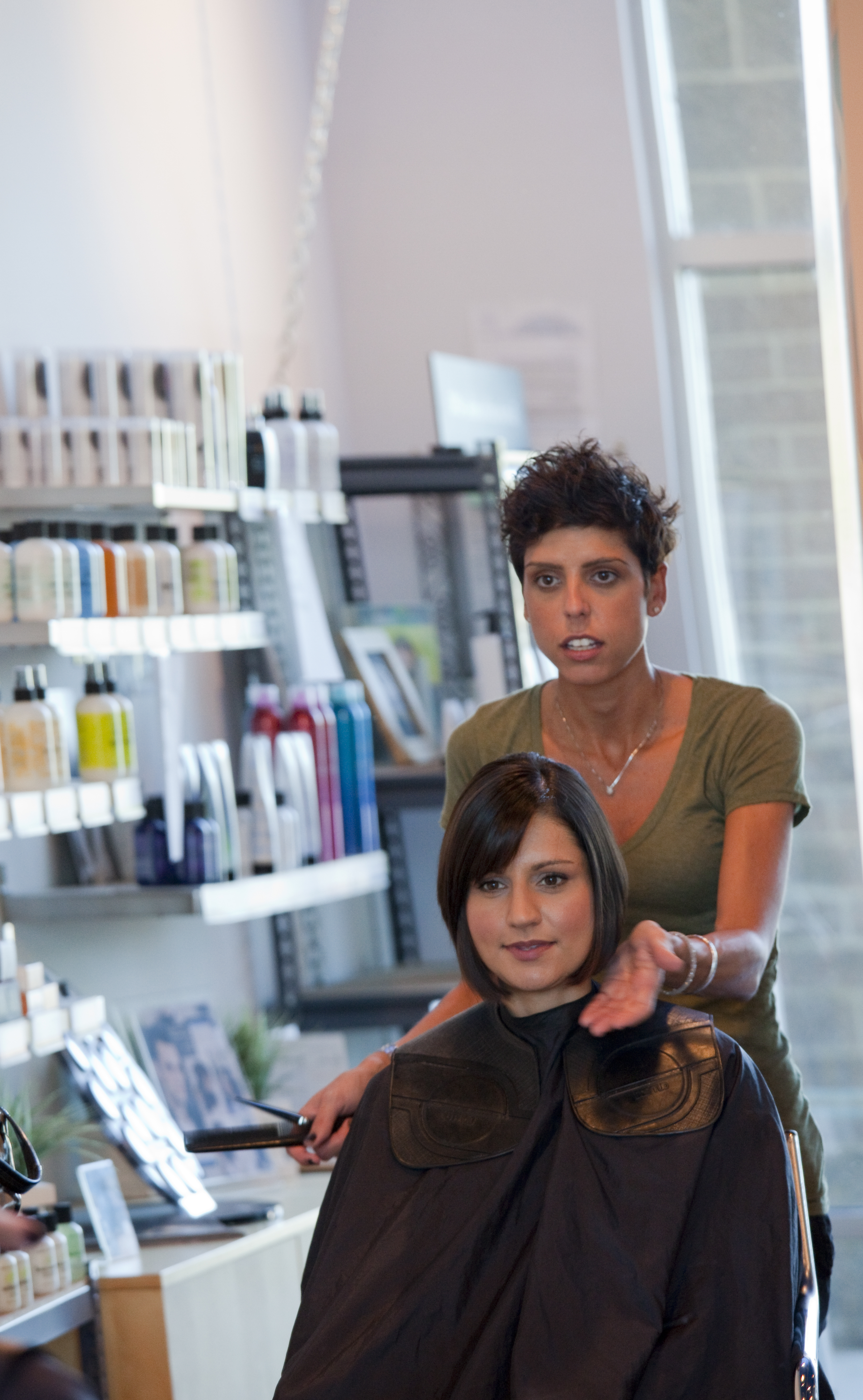 “Mine is asymmetrical because I think it’s more flattering to the face,” she says, “and everybody has a better side. My shorter side is on my better side, and I have the longer side covering up my not-so better half. But, many of my customers want symmetry.”